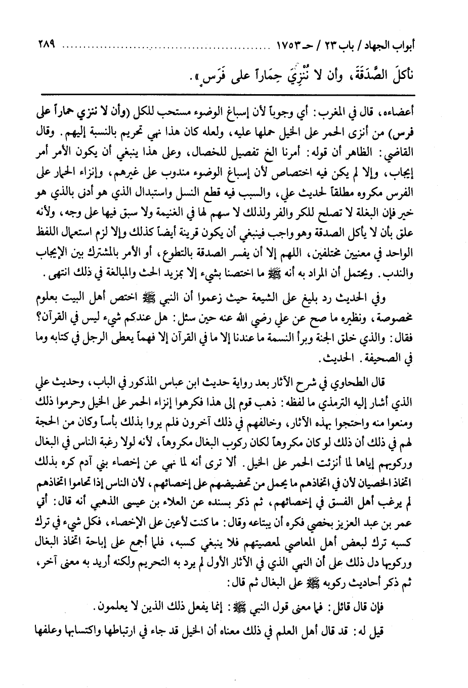 قَالَ الطَّحَاوِيُّ فِي شرح الاثار بعد رواية حديث بن عَبَّاسٍ الْمَذْكُورِ فِي الْبَابِ وَحَدِيثِ عَلِيٍّ الَّذِي أَشَارَ إِلَيْهِ التِّرْمِذِيُّ مَا لَفْظُهُ ذَهَبَ قَوْمٌ إِلَى هَذَا فَكَرِهُوا إِنْزَاءَ الْحُمُرِ عَلَى الْخَيْلِ وَحَرَّمُوا ذَلِكَ وَمَنَعُوا مِنْهُ وَاحْتَجُّوا بِهَذِهِ الْآثَارِ وَخَالَفَهُمْ فِي ذَلِكَ آخَرُونَ فَلَمْ يَرَوْا بِذَلِكَ بَأْسًا وَكَانَ مِنَ الْحُجَّةِ لَهُمْ فِي ذَلِكَ أَنَّ ذَلِكَ لَوْ كَانَ مَكْرُوهًا لَكَانَ رُكُوبُ الْبِغَالِ مَكْرُوهًا لِأَنَّهُ لَوْلَا رَغْبَةُ النَّاسِ فِي الْبِغَالِ وَرُكُوبُهُمْ إِيَّاهَا لَمَا أَنُزِئَتِ الْحُمُرُ عَلَى الْخَيْلِ