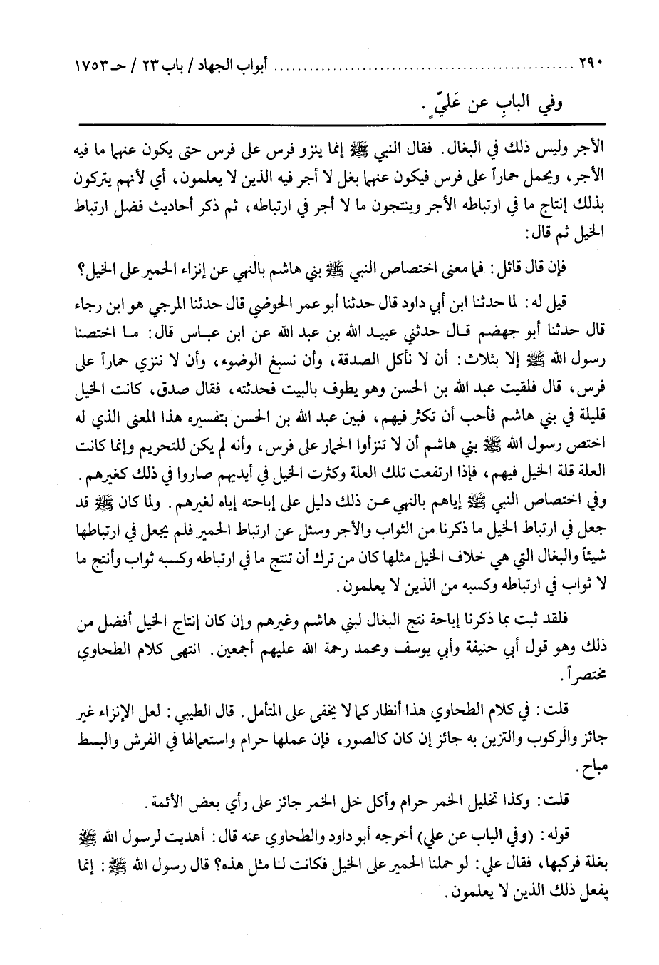 فَقَالَ النَّبِيُّ صَلَّى اللَّهُ عَلَيْهِ وَسَلَّمَ إِنَّمَا يَنْزُو فَرَسٌ عَلَى فَرَسٍ حَتَّى يَكُونَ عَنْهُمَا مَا فِيهِ الْأَجْرُ وَيَحْمِلُ حِمَارًا عَلَى فَرَسٍ فَيَكُونُ عَنْهُمَا بغل لا أجر فيه الذين لَا يَعْلَمُونَ أَيْ لِأَنَّهُمْ يَتْرُكُونَ بِذَلِكَ إِنْتَاجَ مَا فِي ارْتِبَاطِهِ الْأَجْرُ وَيُنْتِجُونَ مَا لَا أَجْرَ فِي ارْتِبَاطِهِ ثُمَّ ذَكَرَ أَحَادِيثَ فَضْلِ ارْتِبَاطِ الْخَيْلِ ثُمَّ قَالَ فَإِنْ قَالَ قَائِلٌ فَمَا مَعْنَى اخْتِصَاصِ النَّبِيِّ صَلَّى اللَّهُ عَلَيْهِ وَسَلَّمَ بَنِي هَاشِمٍ بِالنَّهْيِ عَنْ إِنْزَاءِ الْحَمِيرِ على الخيل قيل له لما حدثنا بن أَبِي دَاوُدَ قَالَ حَدَّثَنَا أَبُو عُمَرَ الْحَوْضِيُّ قال حدثنا المرجي هو بن رَجَاءٍ قَالَ حَدَّثَنَا أَبُو جَهْضَمٍ قَالَ حَدَّثَنِي عبيد الله بن عبد الله عن بن عَبَّاسٍ قَالَ مَا اخْتَصَّنَا رَسُولُ اللَّهِ صَلَّى اللَّهُ عَلَيْهِ وَسَلَّمَ أَلَا بِثَلَاثٍ أَنْ لَا نَأْكُلَ الصَّدَقَةَ وَأَنْ نُسْبِغَ الْوُضُوءَ وَأَنْ لَا نُنْزِيَ حِمَارًا عَلَى فَرَسٍ قَالَ فَلَقِيتُ عَبْدَ اللَّهِ بْنَ الْحَسَنِ وَهُوَ يَطُوفُ بِالْبَيْتِ فَحَدَّثْتُهُ فَقَالَ صَدَقَ كَانَتِ الْخَيْلُ قَلِيلَةً فِي بَنِي هَاشِمٍ فَأَحَبَّ أَنْ تَكْثُرَ فِيهِمْ فَبَيَّنَ عَبْدُ اللَّهِ بْنُ الْحَسَنِ بِتَفْسِيرِهِ هَذَا الْمَعْنَى الَّذِي لَهُ اخْتَصَّ رَسُولُ اللَّهِ صَلَّى اللَّهُ عَلَيْهِ وَسَلَّمَ بَنِي هَاشِمٍ أَنْ لَا تَنْزَءُوا الْحِمَارَ عَلَى فَرَسٍ وَأَنَّهُ لَمْ يَكُنْ لِلتَّحْرِيمِ وَإِنَّمَا كَانَتِ الْعِلَّةُ قِلَّةَ الْخَيْلِ فِيهِمْ فَإِذَا ارْتَفَعَتْ تِلْكَ الْعِلَّةُ وَكَثُرَتِ الْخَيْلُ فِي أَيْدِيهِمْ صَارُوا فِي ذَلِكَ كَغَيْرِهِمْ