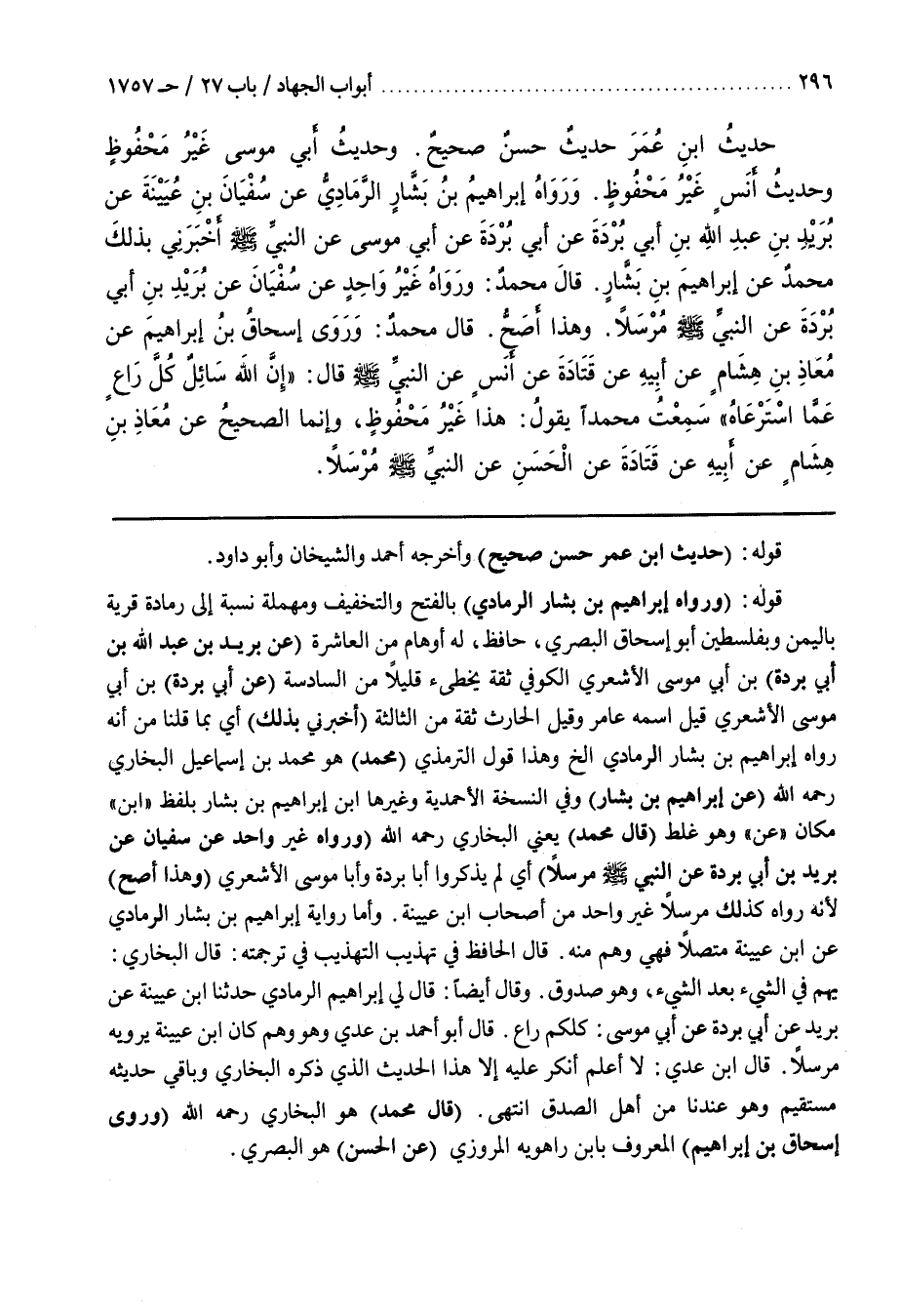 قَوْلُهُ (وَرَوَاهُ إِبْرَاهِيمُ بْنُ بَشَّارٍ الرَّمَادِيُّ) بِالْفَتْحِ وَالتَّخْفِيفِ وَمُهْمَلَةٍ نِسْبَةً إِلَى رَمَادَةَ قَرْيَةٌ بِالْيَمَنِ وَبِفِلَسْطِينَ أَبُو إِسْحَاقَ الْبَصْرِيُّ حَافِظٌ لَهُ أَوْهَامٌ مِنَ الْعَاشِرَةِ (عَنْ بُرَيْدِ بْنِ عَبْدِ اللَّهِ بْنِ أَبِي بُرْدَةَ) بْنِ أَبِي مُوسَى الْأَشْعَرِيِّ الْكُوفِيِّ ثِقَةٌ يُخْطِئُ قَلِيلًا مِنَ السَّادِسَةِ (عَنْ أَبِي بُرْدَةَ) بْنِ أَبِي مُوسَى الْأَشْعَرِيِّ قِيلَ اِسْمُهُ عَامِرٌ وَقِيلَ الْحَارِثُ ثِقَةٌ مِنْ الثَّالِثَةِ (أَخْبَرَنِي بِذَلِكَ) أَيْ بِمَا قُلْنَا مِنْ أَنَّهُ رَوَاهُ إِبْرَاهِيمُ بْنُ بَشَّارٍ الرَّمَادِيُّ إِلَخْ وَهَذَا قَوْلُ التِّرْمِذِيِّ (مُحَمَّدٌ) هُوَ مُحَمَّدُ بْنُ إسماعيل البخاري رحمه الله (عن إِبْرَاهِيمَ بْنِ بَشَّارٍ) وَفِي النُّسْخَةِ الْأَحْمَدِيَّةِ وَغَيْرِهَا بن إبراهيم بن بشار بلفظ بن مَكَانَ عَنْ وَهُوَ غَلَطٌ (قَالَ مُحَمَّدٌ) يَعْنِي الْبُخَارِيَّ رَحِمَهُ اللَّهُ (وَرَوَاهُ غَيْرُ وَاحِدٍ عَنْ سُفْيَانَ عَنْ بُرَيْدِ بْنِ أَبِي بُرْدَةَ عَنِ النَّبِيِّ صَلَّى اللَّهُ عَلَيْهِ وَسَلَّمَ مُرْسَلًا) أَيْ لَمْ يَذْكُرُوا أَبَا بُرْدَةَ وَأَبَا مُوسَى الْأَشْعَرِيَّ (وَهَذَا أَصَحُّ) لِأَنَّهُ رَوَاهُ كَذَلِكَ مُرْسَلًا غَيْرُ واحد من أصحاب بن عُيَيْنَةَ