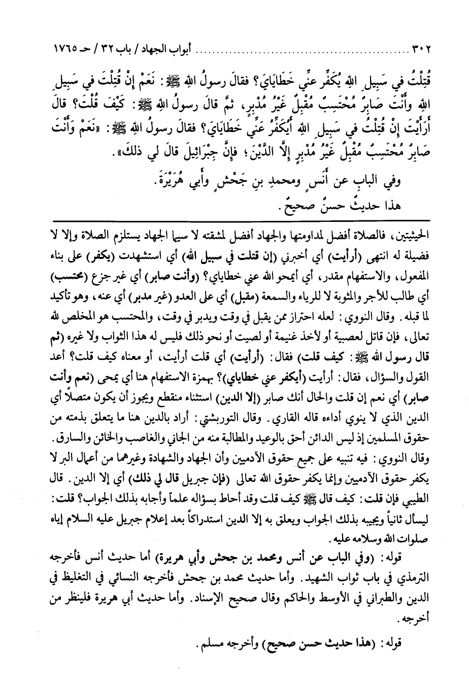 الْحَيْثِيَّتَيْنِ فَالصَّلَاةُ أَفْضَلُ لِمُدَاوَمَتِهَا وَالْجِهَادُ أَفْضَلُ لِمَشَقَّتِهِ لَا سِيَّمَا الْجِهَادُ يَسْتَلْزِمُ الصَّلَاةَ وَإِلَّا لَا فَضِيلَةَ لَهُ انْتَهَى (أَرَأَيْتَ) أَيْ أَخْبِرْنِي (إِنْ قُتِلْتُ فِي سَبِيلِ اللَّهِ) أَيِ اسْتُشْهِدْتُ (يُكَفَّرُ) عَلَى بِنَاءِ الْمَفْعُولِ وَالِاسْتِفْهَامُ مُقَدَّرٌ أَيْ أَيَمْحُو اللَّهُ عَنِّي خَطَايَايَ (وَأَنْتَ صَابِرٌ) أَيْ غَيْرُ جَزِعٍ (مُحْتَسِبٌ) أَيْ طَالِبٌ لِلْأَجْرِ وَالْمَثُوبَةِ لَا لِلرِّيَاءِ وَالسُّمْعَةِ (مُقْبِلٌ) أَيْ عَلَى الْعَدُوِّ (غَيْرُ مُدْبِرٍ) أَيْ عَنْهُ وَهُوَ تَأْكِيدٌ لِمَا قَبْلَهُ