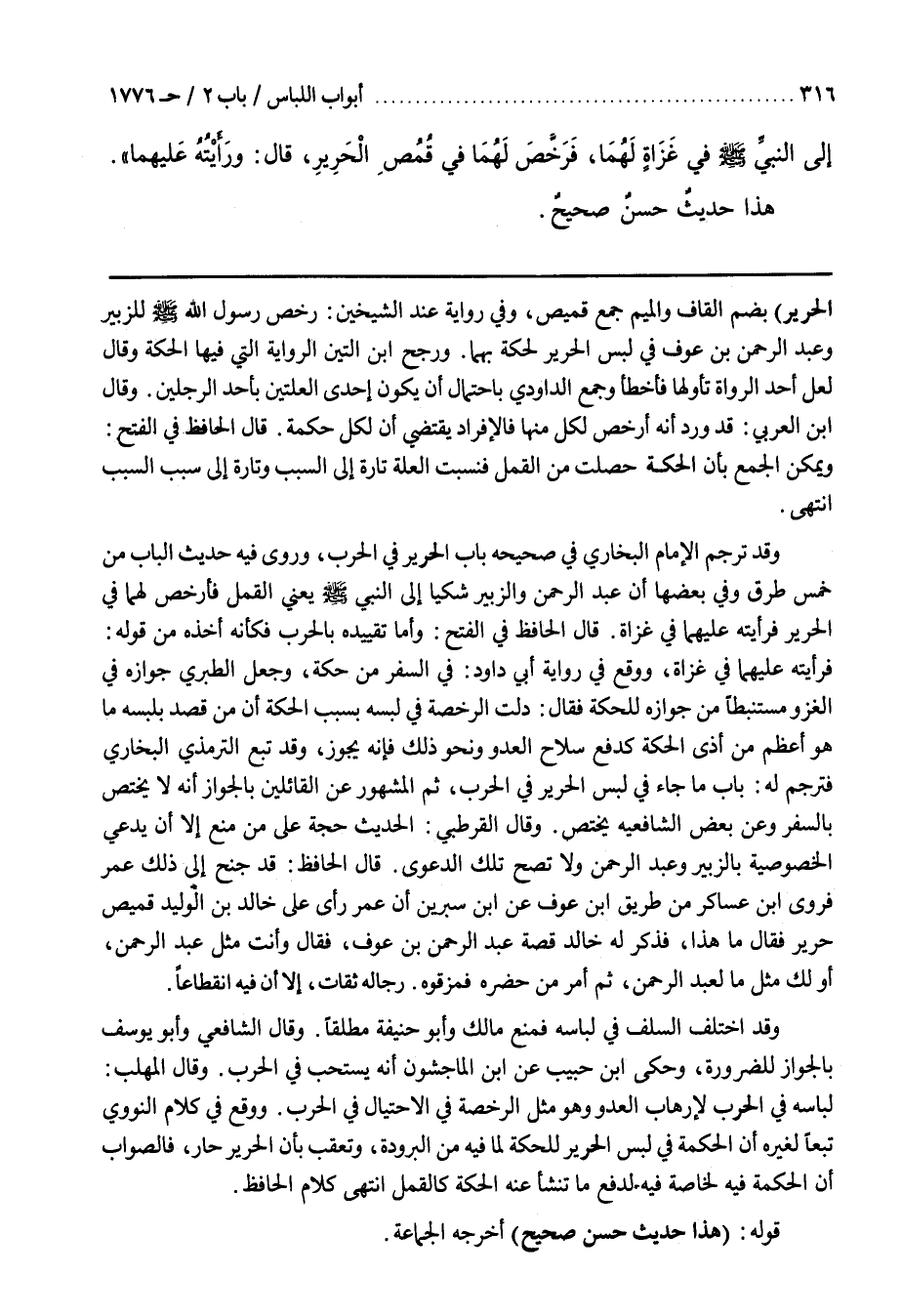 قَالَ الْحَافِظُ فِي الْفَتْحِ وَأَمَّا تَقْيِيدُهُ بِالْحَرْبِ فَكَأَنَّهُ أَخَذَهُ مِنْ قَوْلِهِ فَرَأَيْتُهُ عَلَيْهِمَا فِي غَزَاةٍ وَوَقَعَ فِي رِوَايَةِ أَبِي دَاوُدَ فِي السَّفَرِ مِنْ حَكَّةٍ وَجَعَلَ الطَّبَرِيُّ جَوَازَهُ فِي الْغَزْوِ مُسْتَنْبَطًا مِنْ جَوَازِهِ لِلْحَكَّةِ فَقَالَ دَلَّتِ الرُّخْصَةُ فِي لُبْسِهِ بِسَبَبِ الْحَكَّةِ أَنَّ مَنْ قَصَدَ بِلُبْسِهِ مَا هُوَ أَعْظَمُ مِنْ أَذَى الْحَكَّةِ كَدَفْعِ سِلَاحِ الْعَدُوِّ وَنَحْوِ ذَلِكَ فَإِنَّهُ يَجُوزُ وَقَدْ تَبِعَ التِّرْمِذِيُّ الْبُخَارِيَّ فَتَرْجَمَ لَهُ بَابُ مَا جَاءَ فِي لُبْسِ الْحَرِيرِ فِي الْحَرْبِ ثُمَّ الْمَشْهُورُ عَنِ الْقَائِلِينَ بِالْجَوَازِ أَنَّهُ لَا يَخْتَصُّ بِالسَّفَرِ وَعَنْ بَعْضِ الشَّافِعِيَّةِ يَخْتَصُّ