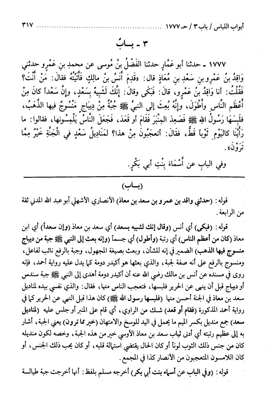 3 - باب [1723] قَوْلُهُ (حَدَّثَنَا وَاقِدُ بْنُ عَمْرِو بْنِ سَعْدِ بْنِ مُعَاذٍ) الْأَنْصَارِيُّ الْأَشْهَلِيُّ أَبُو عَبْدِ اللَّهِ الْمَدَنِيُّ ثِقَةٌ مِنَ الرَّابِعَةِ قَوْلُهُ (فَبَكَى) أَيْ أَنَسٌ (وَقَالَ إِنَّكَ لَشَبِيهٌ بِسَعْدٍ) أَيْ سَعْدِ بن معاذ (وإن سعدا) أي بن مُعَاذٍ (كَانَ مِنْ أَعْظَمِ النَّاسِ) أَيْ رُتْبَةً (وَأَطْوَلَ) أَيْ جِسْمًا (وَإِنَّهُ بُعِثَ إِلَى النَّبِيِّ صَلَّى اللَّهُ عَلَيْهِ وَسَلَّمَ جُبَّةٌ مِنْ دِيبَاجٍ مَنْسُوجٌ فِيهَا الذَّهَبُ) الضَّمِيرُ فِي أَنَّهُ لِلشَّأْنِ وبعث بصيغة المجهول وجبة بالرفع نائب لفاعل وَمَنْسُوجٌ بِالرَّفْعِ عَلَى أَنَّهُ صِفَةٌ لِجُبَّةٍ وَاَلَّذِي بَعَثَهَا هُوَ أُكَيْدِرُ دُومَةَ كَمَا يَدُلُّ عَلَيْهِ رِوَايَةُ أَحْمَدَ فَإِنَّهُ رَوَى فِي مُسْنَدِهِ عَنْ أَنَسِ بْنِ مَالِكٍ رَضِيَ اللَّهُ عَنْهُ أَنَّ أُكَيْدِرَ دُومَةَ أَهْدَى إِلَى النَّبِيِّ صَلَّى اللَّهُ عَلَيْهِ وَسَلَّمَ جُبَّةَ سُنْدُسٍ أَوْ دِيبَاجٍ قَبْلَ أَنْ يَنْهَى عَنِ الْحَرِيرِ فَلَبِسَهَا فَتَعَجَّبَ النَّاسُ عنها فَقَالَ وَاَلَّذِي نَفْسِي بِيَدِهِ لَمَنَادِيلُ سَعْدِ بْنِ مُعَاذٍ فِي الْجَنَّةِ أَحْسَنُ مِنْهَا (فَلَبِسَهَا رَسُولُ اللَّهِ صَلَّى اللَّهُ عَلَيْهِ وَسَلَّمَ) كَانَ هَذَا قَبْلَ النَّهْيِ عَنِ الْحَرِيرِ كَمَا فِي رِوَايَةِ أحمد المذكورة (فقام أو قعد) فشك مِنَ الرَّاوِي أَيْ قَامَ عَلَى الْمِنْبَرِ أَوْ جَلَسَ عَلَيْهِ (لَمَنَادِيلُ سَعْدٍ) جَمْعُ مِنْدِيلٍ بِكَسْرِ الْمِيمِ مَا يُحْمَلُ فِي الْيَدِ لِلْوَسَخِ وَالِامْتِهَانِ (خَيْرٌ مِمَّا تَرَوْنَ) يَعْنِي الْجُبَّةَ أَشَارَ بِهِ إِلَى عَظِيمِ رُتْبَتِهِ أَيْ أَدْنَى ثِيَابِ سَعْدِ بْنِ مُعَاذٍ الْأَوْسِيِّ خَيْرٌ مِنْ هَذِهِ الْجُبَّةِ وَخَصَّهُ لِكَوْنِ مِنْدِيلِهِ كَانَ مِنْ جِنْسِ ذَلِكَ الثَّوْبِ لَوْنًا أَوْ كَانَ الْحَالُ يَقْتَضِي اسْتِمَالَةَ قَلْبِهِ أَوْ كَانَ يُحِبُّ ذَلِكَ الْجِنْسَ أَوْ كَانَ اللَّامِسُونَ الْمُتَعَجِّبُونَ مِنَ الْأَنْصَارِ كَذَا فِي الْمَجْمَعِ