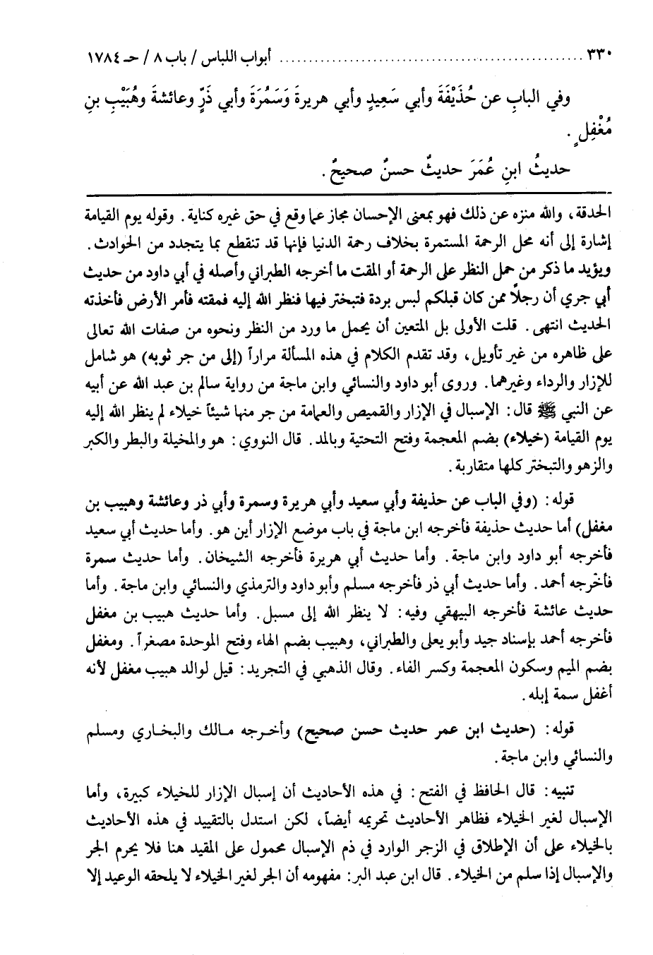 قُلْتُ الْأَوْلَى بَلِ الْمُتَعَيِّنُ أَنْ يُحْمَلَ مَا وَرَدَ مِنَ النَّظَرِ وَنَحْوِهِ مِنْ صِفَاتِ اللَّهِ تَعَالَى عَلَى ظَاهِرِهِ مِنْ غَيْرِ تَأْوِيلٍ وَقَدْ تَقَدَّمَ الْكَلَامُ فِي هَذِهِ الْمَسْأَلَةِ مِرَارًا (إِلَى مَنْ جَرَّ ثَوْبَهُ) هُوَ شَامِلٌ لِلْإِزَارِ وَالرِّدَاءِ وَغَيْرِهِمَا