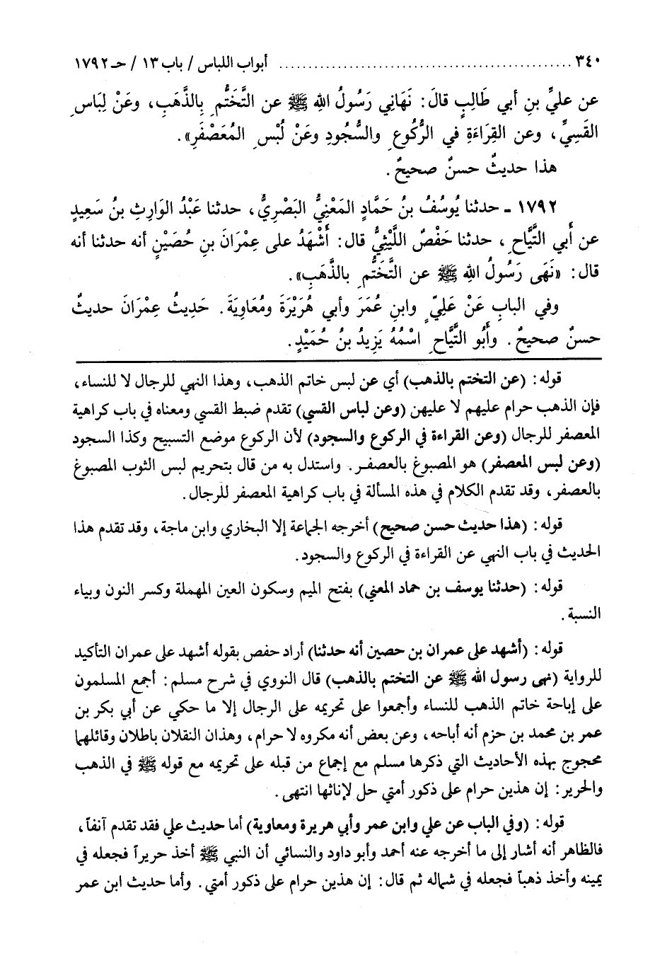 قَوْلُهُ (أَشْهَدُ عَلَى عِمْرَانَ بْنِ حُصَيْنٍ أَنَّهُ حَدَّثَنَا) أَرَادَ حَفْصٌ بِقَوْلِهِ أَشْهَدُ عَلَى عِمْرَانَ التَّأْكِيدَ لِلرِّوَايَةِ (نَهَى رَسُولُ اللَّهِ صَلَّى اللَّهُ عَلَيْهِ وَسَلَّمَ عَنِ التَّخَتُّمِ بِالذَّهَبِ) قَالَ النَّوَوِيُّ فِي شَرْحِ مُسْلِمٍ أَجْمَعَ الْمُسْلِمُونَ عَلَى إِبَاحَةِ خَاتَمِ الذَّهَبِ لِلنِّسَاءِ وَأَجْمَعُوا عَلَى تَحْرِيمِهِ عَلَى الرِّجَالِ إِلَّا مَا حُكِيَ عَنْ أَبِي بَكْرِ بْنِ عُمَرَ بْنِ مُحَمَّدِ بْنِ حَزْمٍ أَنَّهُ أَبَاحَهُ وَعَنْ بَعْضٍ أَنَّهُ مَكْرُوهٌ لَا حَرَامٌ وَهَذَانِ النَّقْلَانِ بَاطِلَانِ وَقَائِلُهُمَا مَحْجُوجٌ بِهَذِهِ الْأَحَادِيثِ الَّتِي ذَكَرَهَا مُسْلِمٌ مَعَ إِجْمَاعِ مَنْ قَبْلَهُ عَلَى تَحْرِيمِهِ مَعَ قَوْلِهِ صَلَّى اللَّهُ عَلَيْهِ وَسَلَّمَ فِي الذَّهَبِ وَالْحَرِيرِ إِنَّ هَذَيْنِ حَرَامٌ عَلَى ذُكُورِ أُمَّتِي حِلٌّ لِإِنَاثِهَا انْتَهَى
