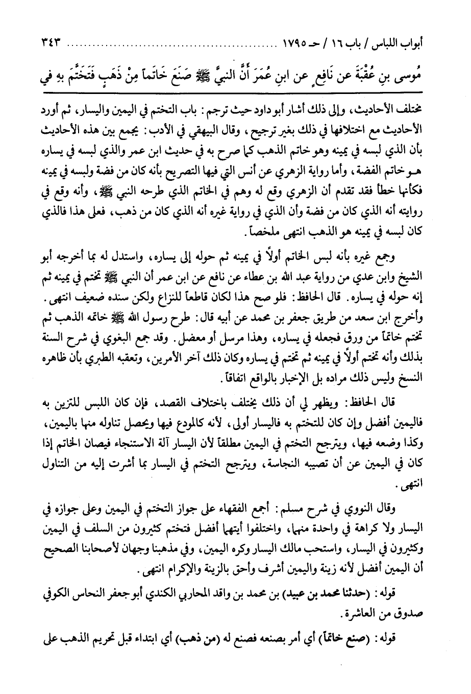 وَجَمَعَ غَيْرُهُ بِأَنَّهُ لَبِسَ الْخَاتَمَ أَوَّلًا فِي يَمِينِهِ ثُمَّ حَوَّلَهُ إِلَى يَسَارِهِ وَاسْتَدَلَّ له بما أخرجه أبو الشيخ وبن عَدِيٍّ مِنْ رِوَايَةِ عَبْدِ اللَّهِ بْنِ عَطَاءٍ عن نافع عن بن عُمَرَ أَنَّ النَّبِيَّ صَلَّى اللَّهُ عَلَيْهِ وَسَلَّمَ تَخَتَّمَ فِي يَمِينِهِ ثُمَّ إِنَّهُ حَوَّلَهُ فِي يَسَارِهِ