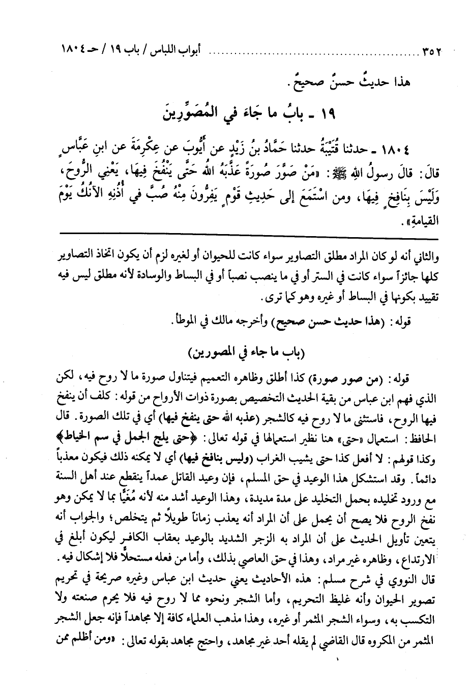 قَالَ النَّوَوِيُّ فِي شَرْحِ مُسْلِمٍ هَذِهِ الْأَحَادِيثُ يَعْنِي حَدِيثَ بن عَبَّاسٍ وَغَيْرِهِ صَرِيحَةٌ فِي تَحْرِيمِ تَصْوِيرِ الْحَيَوَانِ وَأَنَّهُ غَلِيظُ التَّحْرِيمِ وَأَمَّا الشَّجَرُ وَنَحْوُهُ مِمَّا لَا رُوحَ فِيهِ فَلَا يَحْرُمُ صَنْعَتُهُ وَلَا التَّكَسُّبُ بِهِ وَسَوَاءٌ الشَّجَرُ الْمُثْمِرُ أَوْ غَيْرُهُ وَهَذَا مَذْهَبُ الْعُلَمَاءِ كَافَّةً إِلَّا مُجَاهِدًا فَإِنَّهُ جَعَلَ الشَّجَرَ الْمُثْمِرَ مِنَ الْمَكْرُوهِ قَالَ الْقَاضِي لَمْ يَقُلْهُ أَحَدٌ غَيْرُ مُجَاهِدٍ وَاحْتَجَّ مُجَاهِدٌ بِقَوْلِهِ تَعَالَى وَمَنْ أَظْلَمُ مِمَّنْ