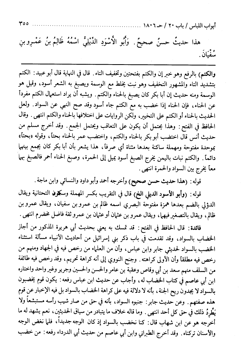 قَوْلُهُ (وَأَبُو الْأَسْوَدِ الدِّيلِيُّ إِلَخْ) قَالَ فِي التَّقْرِيبِ بِكَسْرِ الْمُهْمَلَةِ وَسُكُونِ التَّحْتَانِيَّةِ وَيُقَالُ الدُّؤَلِيُّ بِالضَّمِّ بَعْدَهَا هَمْزَةٌ مَفْتُوحَةٌ الْبَصْرِيُّ اسْمُهُ ظَالِمُ بْنُ عَمْرِو بْنِ سُفْيَانَ وَيُقَالُ عَمْرُو بْنُ ظَالِمٍ وَيُقَالُ بِالتَّصْغِيرِ فِيهِمَا وَيُقَالُ عَمْرُو بْنُ عُثْمَانَ أَوْ عُثْمَانُ بْنُ عَمْرٍو ثِقَةٌ فَاضِلٌ مُخَضْرَمٌ انْتَهَى فَائِدَةٌ قَالَ الْحَافِظُ فِي الْفَتْحِ قَدْ تَمَسَّكَ بِهِ يَعْنِي بِحَدِيثِ أَبِي هُرَيْرَةَ الْمَذْكُورِ مَنْ أَجَازَ الْخِضَابَ بِالسَّوَادِ وَقَدْ تَقَدَّمَتْ فِي بَابِ ذِكْرِ بَنِي إِسْرَائِيلَ مِنْ أَحَادِيثِ الْأَنْبِيَاءِ مَسْأَلَةُ اسْتِثْنَاءِ الْخَضْبِ بِالسَّوَادِ لِحَدِيثَيْ جابر وبن عَبَّاسٍ وَأَنَّ مِنَ الْعُلَمَاءِ مَنْ رَخَّصَ فِيهِ فِي الْجِهَادِ وَمِنْهُمْ مَنْ رَخَّصَ فِيهِ مُطْلَقًا وَأَنَّ الْأَوْلَى كَرَاهَتُهُ