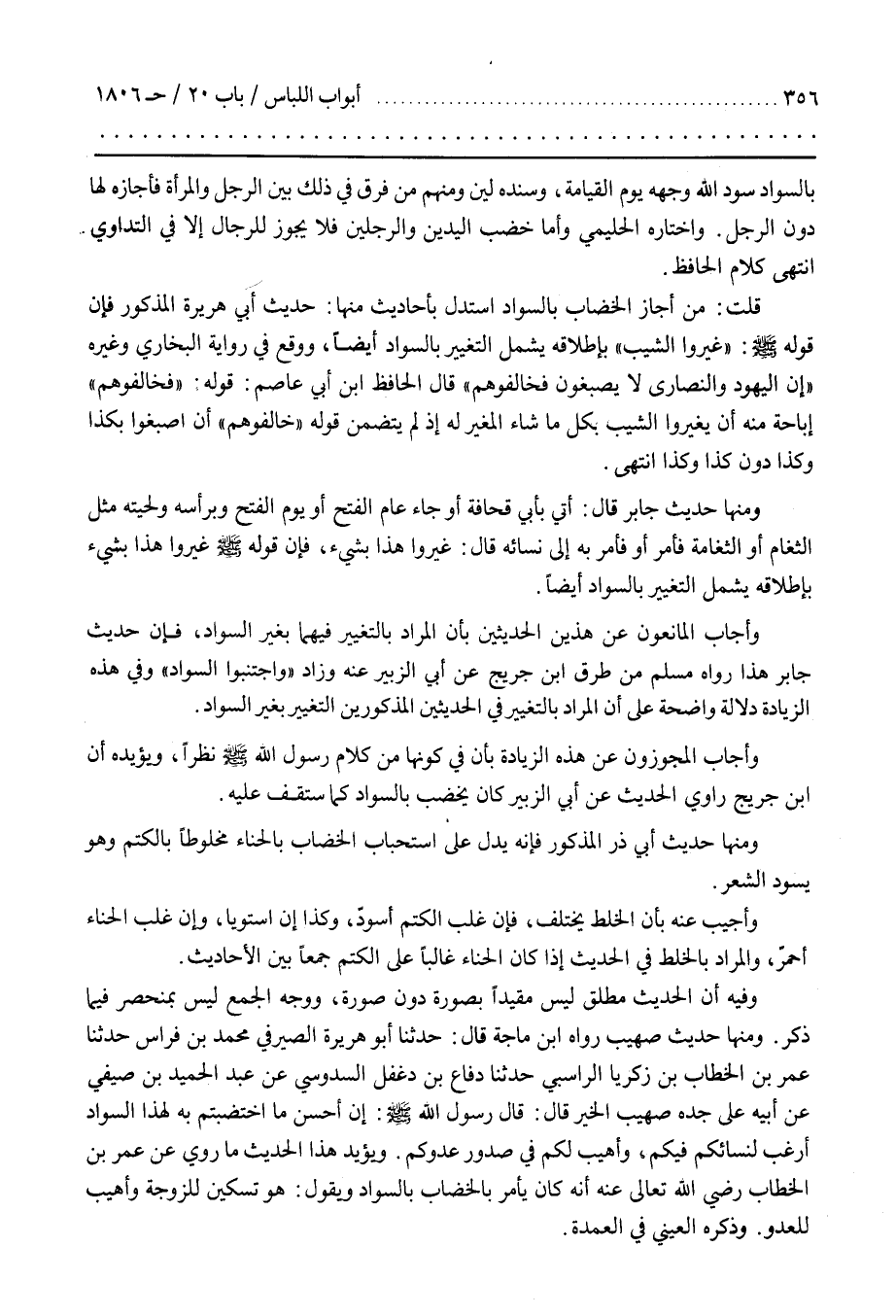 بِالسَّوَادِ سَوَّدَ اللَّهُ وَجْهَهُ يَوْمَ الْقِيَامَةِ وَسَنَدُهُ لَيِّنٌ وَمِنْهُمْ مَنْ فَرَّقَ فِي ذَلِكَ بَيْنَ الرَّجُلِ وَالْمَرْأَةِ فَأَجَازَهُ لَهَا دُونَ الرَّجُلِ