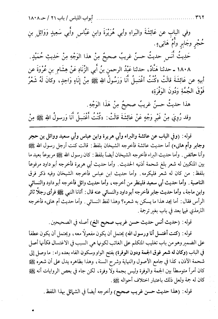 [1755] قَوْلُهُ (كُنْتُ أَغْتَسِلُ أَنَا وَرَسُولُ اللَّهِ) يُحْتَمَلُ أَنْ يَكُونَ مَفْعُولًا مَعَهُ وَيُحْتَمَلُ أَنْ يَكُونَ عَطْفًا عَلَى الضَّمِيرِ وَهُوَ مِنْ بَابِ تَغْلِيبِ الْمُتَكَلِّمِ عَلَى الْغَائِبِ لِكَوْنِهَا هِيَ السَّبَبَ فِي الِاغْتِسَالِ فَكَأَنَّهَا أَصْلٌ فِي الْبَابِ (وَكَانَ لَهُ شَعْرٌ فَوْقَ الْجُمَّةِ وَدُونَ الْوَفْرَةِ) بِفَتْحِ الْوَاوِ وَسُكُونِ الْفَاءِ بَعْدَهُ رَاءٌ مَا وَصَلَ إِلَى شَحْمَةِ الْأُذُنِ كَذَا فِي جَامِعِ الْأُصُولِ وَالنِّهَايَةِ وَشَرْحِ السُّنَّةِ وَهَذَا بِظَاهِرِهِ يَدُلُّ عَلَى أَنَّ شَعْرَهُ صَلَّى اللَّهُ عَلَيْهِ وَسَلَّمَ كَانَ أَمْرًا مُتَوَسِّطًا بَيْنَ الْجُمَّةِ وَالْوَفْرَةِ وَلَيْسَ بِجُمَّةٍ وَلَا وَفْرَةٍ لَكِنْ جَاءَ فِي بَعْضِ الرِّوَايَاتِ أَنَّهُ صَلَّى اللَّهُ عَلَيْهِ وَسَلَّمَ كَانَ لَهُ جُمَّةٌ وَلَعَلَّ ذَلِكَ بِاعْتِبَارِ اخْتِلَافِ أَحْوَالِهِ صَلَّى اللَّهُ عَلَيْهِ وَسَلَّمَ
