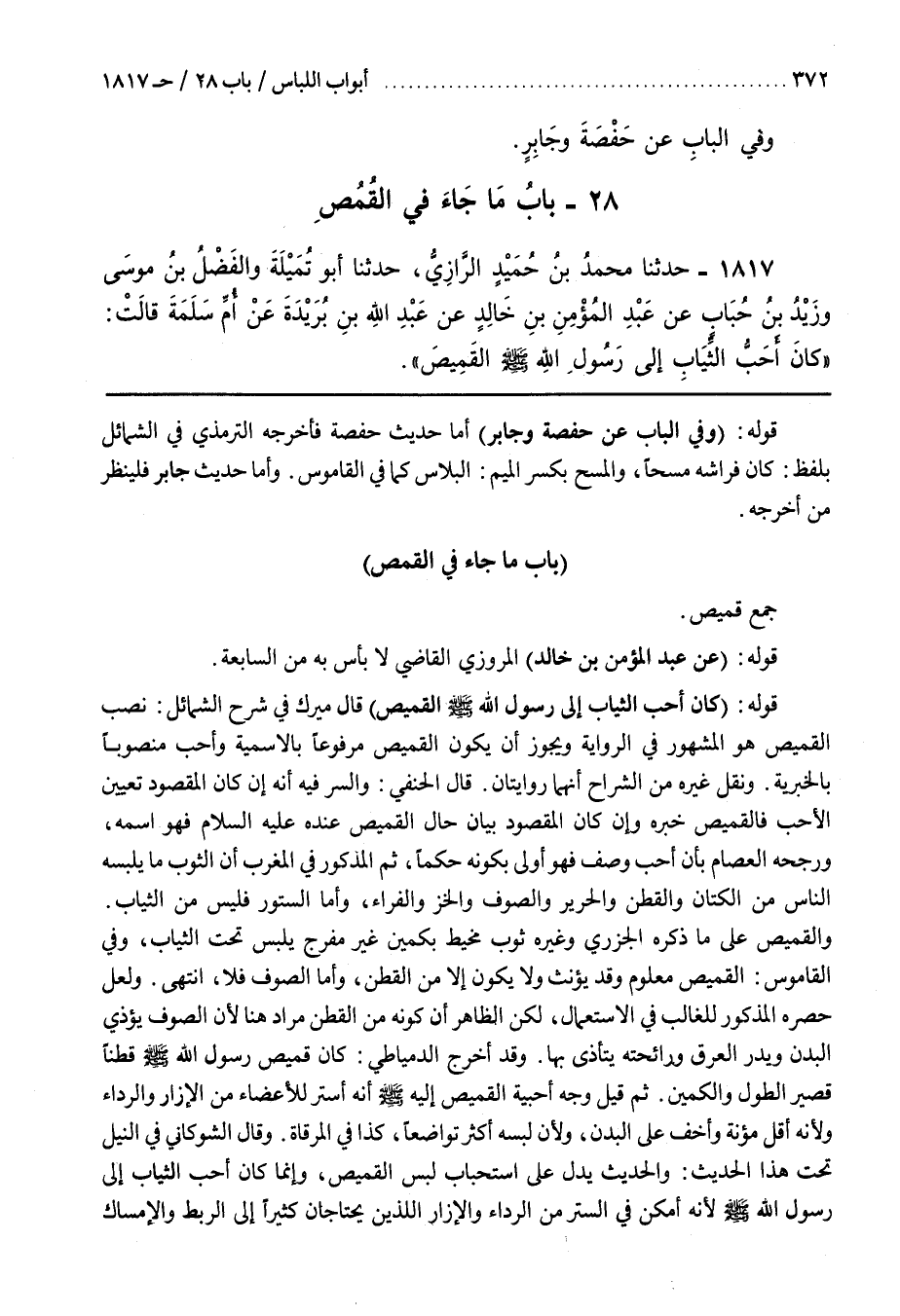 وقَالَ الشَّوْكَانِيُّ فِي النَّيْلِ تَحْتَ هَذَا الْحَدِيثِ وَالْحَدِيثُ يَدُلُّ عَلَى اسْتِحْبَابِ لُبْسِ الْقَمِيصِ وَإِنَّمَا كَانَ أحب الثياب إِلَى رَسُولِ اللَّهِ صَلَّى اللَّهُ عَلَيْهِ وَسَلَّمَ لِأَنَّهُ أَمْكَنُ فِي السَّتْرِ مِنَ الرِّدَاءِ وَالْإِزَارِ اللَّذَيْنِ يَحْتَاجَانِ كَثِيرًا إِلَى الرَّبْطِ والإمساك