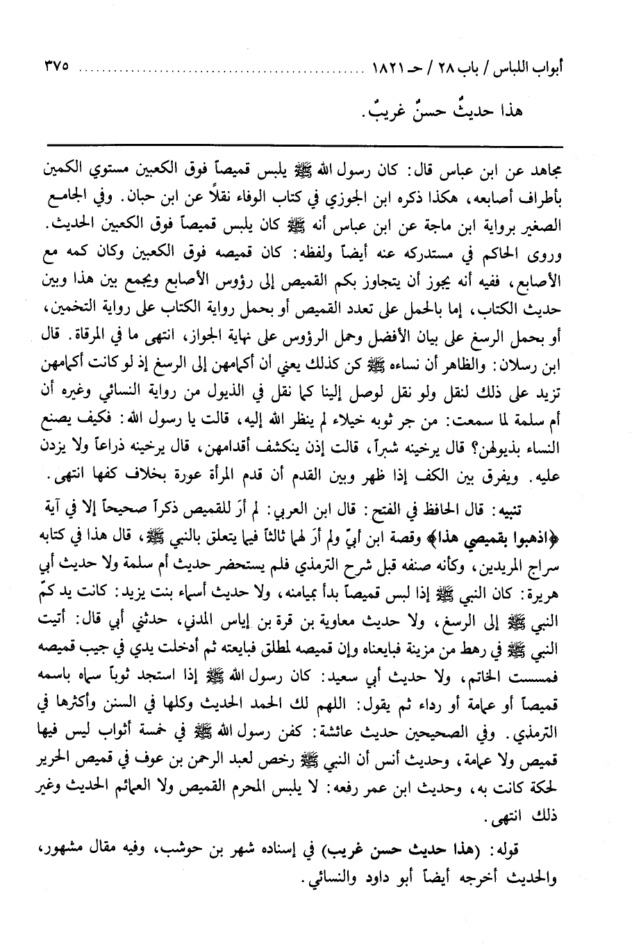 تنبيه قال الحافظ في الفتح قال بن الْعَرَبِيِّ لَمْ أَرَ لِلْقَمِيصِ ذِكْرًا صَحِيحًا إِلَّا في آية (اذهبوا بقميصي هذا) وقصة بن أُبَيٍّ وَلَمْ أَرَ لَهُمَا ثَالِثًا فِيمَا يَتَعَلَّقُ بِالنَّبِيِّ صَلَّى اللَّهُ عَلَيْهِ وَسَلَّمَ قَالَ هَذَا فِي كِتَابِهِ سِرَاجُ الْمُرِيدِينَ وَكَأَنَّهُ صَنَّفَهُ قَبْلَ شَرْحِ التِّرْمِذِيِّ فَلَمْ يَسْتَحْضِرْ حَدِيثَ أُمِّ سَلَمَةَ وَلَا حَدِيثَ أَبِي هُرَيْرَةَ كَانَ النَّبِيُّ صَلَّى اللَّهُ عَلَيْهِ وَسَلَّمَ إِذَا لَبِسَ قَمِيصًا بَدَأَ بِمَيَامِنِهِ وَلَا حَدِيثَ أَسْمَاءَ بِنْتِ يَزِيدَ كَانَتْ يدكم النَّبِيِّ صَلَّى اللَّهُ عَلَيْهِ وَسَلَّمَ إِلَى الرُّسْغِ وَلَا حَدِيثَ مُعَاوِيَةَ بْنِ قُرَّةَ بْنِ إِيَاسٍ الْمَدَنِيِّ حَدَّثَنِي أَبِي قَالَ أَتَيْتُ النَّبِيَّ صَلَّى اللَّهُ عَلَيْهِ وَسَلَّمَ فِي رَهْطٍ مِنْ مُزَيْنَةَ فَبَايَعْنَاهُ وَإِنَّ قَمِيصَهُ لَمُطْلَقٌ فَبَايَعْتُهُ ثُمَّ أَدْخَلْتُ يَدِي فِي جَيْبِ قَمِيصِهِ فَمَسِسْتُ الْخَاتَمَ وَلَا حَدِيثَ أَبِي سَعِيدٍ كَانَ رَسُولُ اللَّهِ صَلَّى اللَّهُ عَلَيْهِ وَسَلَّمَ إِذَا اسْتَجَدَّ ثَوْبًا سَمَّاهُ بِاسْمِهِ قَمِيصًا أَوْ عِمَامَةً أَوْ رِدَاءً ثُمَّ يَقُولُ اللَّهُمَّ لَكَ الْحَمْدُ الْحَدِيثَ وَكُلُّهَا فِي سنن وَأَكْثَرُهَا فِي التِّرْمِذِيِّ