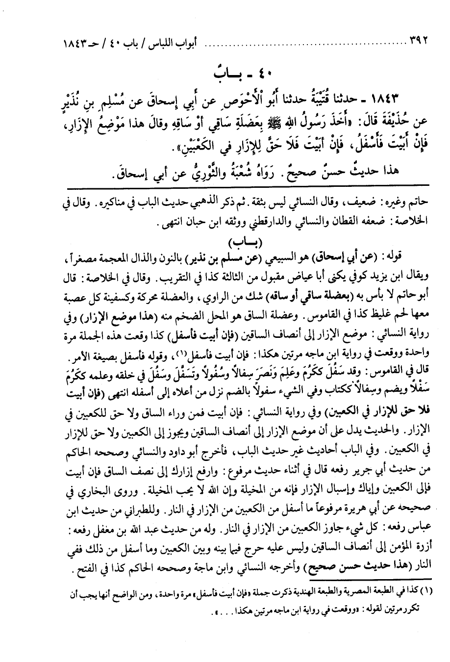 وَقَالَ فِي الْخُلَاصَةِ قَالَ أَبُو حَاتِمٍ لَا بَأْسَ بِهِ (بِعَضَلَةِ سَاقِي أَوْ سَاقِهِ) شَكٌّ مِنَ الرَّاوِي وَالْعَضَلَةُ مُحَرَّكَةً وَكَسَفِينَةٍ كُلُّ عَصَبَةٍ مَعَهَا لَحْمٌ غَلِيظٌ كَذَا فِي الْقَامُوسِ وَعَضَلَةُ السَّاقِ هُوَ الْمَحَلُّ الضَّخْمِ مِنْهُ (هَذَا مَوْضِعُ الْإِزَارِ) وَفِي رِوَايَةِ النَّسَائِيِّ مَوْضِعُ الْإِزَارِ إِلَى أَنْصَافِ السَّاقَيْنِ (فَإِنْ أَبَيْتَ فَأَسْفَلُ) كَذَا وَقَعَتْ هَذِهِ الْجُمْلَةُ مَرَّةً واحدة ووقعت في رواية بن مَاجَهْ مَرَّتَيْنِ هَكَذَا فَإِنْ أَبَيْتَ فَأَسْفَلُ وَقَوْلُهُ فَأَسْفَلُ بِصِيغَةِ الْأَمْرِ