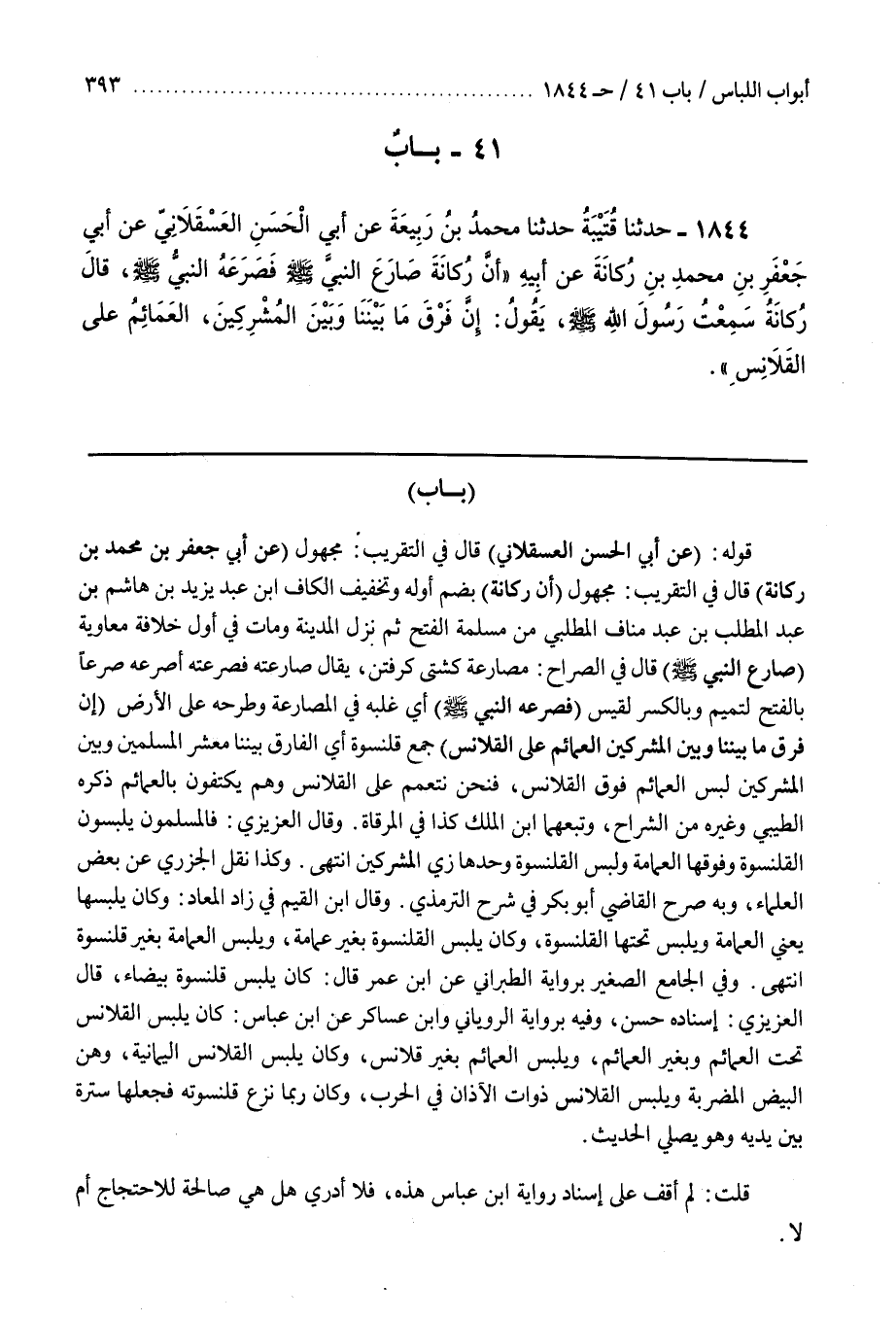 42 - [1784] قَوْلُهُ (عَنْ أَبِي الْحَسَنِ الْعَسْقَلَانِيِّ) قَالَ فِي التَّقْرِيبِ مَجْهُولٌ (عَنْ أَبِي جَعْفَرِ بْنِ مُحَمَّدِ بْنِ رُكَانَةَ) قَالَ فِي التَّقْرِيبِ مَجْهُولٌ (أَنَّ ركانة) بضم أوله وتخفيف الكاف بْنِ عَبْدِ يَزِيدَ بْنِ هَاشِمِ بْنِ عَبْدِ الْمُطَّلِبِ بْنِ عَبْدِ مَنَافٍ الْمُطَّلِبِيِّ مِنْ مُسْلِمَةِ الْفَتْحِ ثُمَّ نَزَلَ الْمَدِينَةَ وَمَاتَ فِي أَوَّلِ خِلَافَةِ مُعَاوِيَةَ (صَارَعَ النَّبِيَّ صَلَّى اللَّهُ عَلَيْهِ وَسَلَّمَ) قَالَ فِي الصُّرَاحِ مصارعه كشتى كرفتن يُقَالُ صَارَعْتُهُ فَصَرَعْتُهُ أَصْرَعُهُ صَرْعًا بِالْفَتْحِ لِتَمِيمٍ وَبِالْكَسْرِ لِقَيْسٍ (فَصَرَعَهُ النَّبِيُّ صَلَّى اللَّهُ عَلَيْهِ وَسَلَّمَ) أَيْ غَلَبَهُ فِي الْمُصَارَعَةِ وَطَرَحَهُ عَلَى الْأَرْضِ (إِنَّ فَرْقَ مَا بَيْنَنَا وَبَيْنَ الْمُشْرِكِينَ الْعَمَائِمُ عَلَى الْقَلَانِسِ) جَمْعُ قَلَنْسُوَةٍ أَيِ الْفَارِقُ بَيْنَنَا مَعْشَرَ الْمُسْلِمِينَ وَبَيْنَ الْمُشْرِكِينَ لُبْسُ الْعَمَائِمِ فَوْقَ الْقَلَانِسِ فَنَحْنُ نَتَعَمَّمُ عَلَى الْقَلَانِسِ وَهُمْ يَكْتَفُونَ بِالْعَمَائِمِ ذَكَرَهُ الطِّيبِيُّ وَغَيْرُهُ مِنَ الشُّرَّاحِ وَتَبِعَهُمَا بن الْمَلَكِ كَذَا فِي الْمِرْقَاةِ