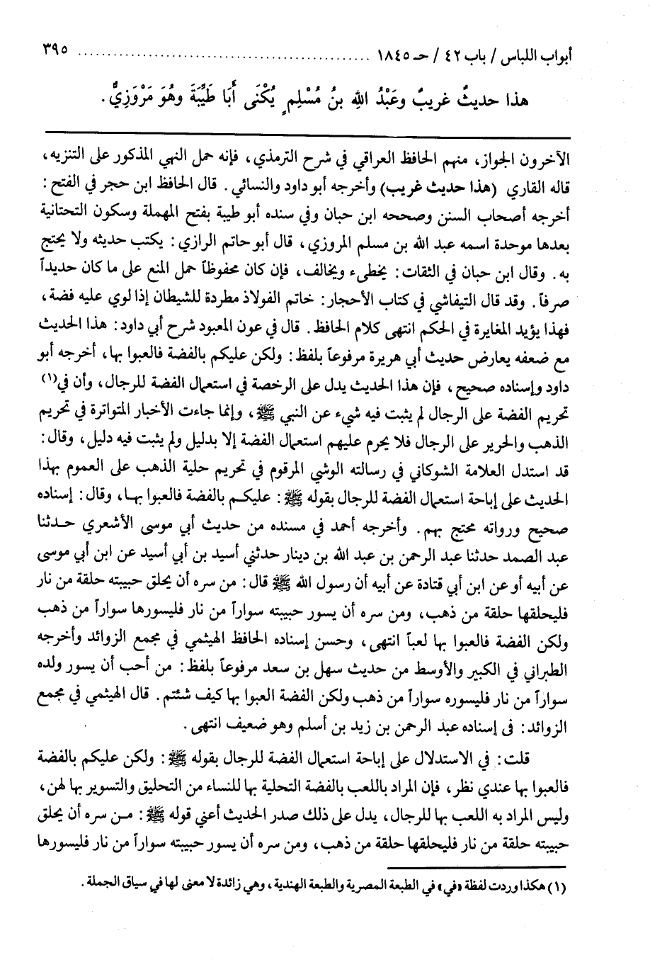 قَالَ فِي عَوْنِ الْمَعْبُودِ شَرْحِ أَبِي دَاوُدَ هَذَا الْحَدِيثُ مَعَ ضَعْفِهِ يُعَارِضُ حَدِيثَ أَبِي هُرَيْرَةَ مَرْفُوعًا بِلَفْظِ وَلَكِنْ عَلَيْكُمْ بالفضة فالعبوا بها أخرجه أبو داود وإسناده صَحِيحٌ فَإِنَّ هَذَا الْحَدِيثَ يَدُلُّ عَلَى الرُّخْصَةِ فِي اسْتِعْمَالِ الْفِضَّةِ لِلرِّجَالِ وَأَنَّ فِي تَحْرِيمِ الْفِضَّةِ عَلَى الرِّجَالِ لَمْ يَثْبُتْ فِيهِ شَيْءٌ عَنِ النَّبِيِّ صَلَّى اللَّهُ عَلَيْهِ وَسَلَّمَ وَإِنَّمَا جَاءَتِ الْأَخْبَارُ الْمُتَوَاتِرَةُ فِي تَحْرِيمِ الذَّهَبِ وَالْحَرِيرِ عَلَى الرِّجَالِ فَلَا يَحْرُمُ عَلَيْهِمُ اسْتِعْمَالُ الْفِضَّةِ إِلَّا بِدَلِيلٍ وَلَمْ يَثْبُتْ فِيهِ دَلِيلٌ وَقَالَ قَدِ اسْتَدَلَّ الْعَلَّامَةُ الشَّوْكَانِيُّ فِي رِسَالَتِهِ الْوَشْيُ الْمَرْقُومُ فِي تَحْرِيمِ حِلْيَةِ الذَّهَبِ عَلَى الْعُمُومِ بِهَذَا الْحَدِيثِ عَلَى إِبَاحَةِ اسْتِعْمَالِ الْفِضَّةِ لِلرِّجَالِ بِقَوْلِهِ صَلَّى اللَّهُ عَلَيْهِ وَسَلَّمَ عَلَيْكُمْ بِالْفِضَّةِ فَالْعَبُوا بِهَا وَقَالَ إِسْنَادُهُ صَحِيحٌ وَرُوَاتُهُ مُحْتَجٌّ بِهِمْ