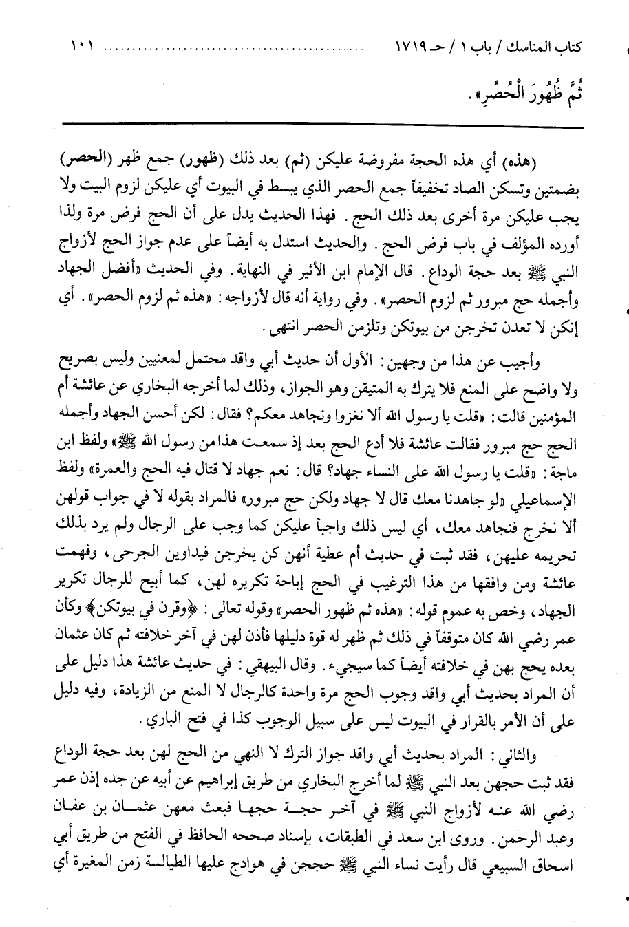 وَأُجِيبَ عَنْ هَذَا مِنْ وَجْهَيْنِ الْأَوَّلُ أَنَّ حَدِيثَ أَبِي وَاقِدٍ مُحْتَمِلٌ لِمَعْنَيَيْنِ وَلَيْسَ بِصَرِيحٍ وَلَا وَاضِحٍ عَلَى الْمَنْعِ فَلَا يُتْرَكُ بِهِ الْمُتَيَقَّنُ وَهُوَ الْجَوَازُ وَذَلِكَ لِمَا أَخْرَجَهُ الْبُخَارِيُّ عَنْ عَائِشَةَ أُمِّ المؤمنين قالت قلت يارسول الله ألا نغزوا وَنُجَاهِدُ مَعَكُمْ فَقَالَ لَكِنْ أَحْسَنُ الْجِهَادِ وَأَجْمَلُهُ الْحَجُّ حَجٌّ مَبْرُورٌ فَقَالَتْ عَائِشَةُ فَلَا أَدَعُ الْحَجَّ بَعْدَ إِذْ سَمِعْتُ هَذَا مِنْ رَسُولِ اللَّهِ صَلَّى اللَّهُ عَلَيْهِ وَسَلَّمَ ولفظ بن ماجه قلت يارسول اللَّهِ عَلَى النِّسَاءِ جِهَادٌ قَالَ نَعَمْ جِهَادٌ لَا قِتَالَ فِيهِ الْحَجُّ وَالْعُمْرَةُ وَلَفْظُ الْإِسْمَاعِيلِيِّ لَوْ جَاهَدْنَا مَعَكَ قَالَ لَا جِهَادَ وَلَكِنْ حَجٌّ مَبْرُورٌ فَالْمُرَادُ بِقَوْلِهِ لَا فِي جَوَابِ قَوْلِهِنَّ أَلَا نَخْرُجُ فَنُجَاهِدَ مَعَكَ أَيْ لَيْسَ ذَلِكَ وَاجِبًا عَلَيْكُنَّ كَمَا وَجَبَ عَلَى الرِّجَالِ وَلَمْ يُرِدْ بِذَلِكَ تَحْرِيمُهُ عَلَيْهِنَّ فَقَدْ ثَبَتَ فِي حَدِيثِ أُمِّ عَطِيَّةَ أَنَّهُنَّ كُنَّ يَخْرُجْنَ فَيُدَاوِينَ الْجَرْحَى وَفَهِمَتْ عَائِشَةُ وَمَنْ وَافَقَهَا مِنْ هَذَا التَّرْغِيبِ فِي الْحَجِّ إِبَاحَةَ تَكْرِيرِهِ لَهُنَّ كَمَا أُبِيحَ لِلرِّجَالِ تَكْرِيرُ الْجِهَادِ وَخُصَّ بِهِ عُمُومُ قَوْلِهِ هَذِهِ ثُمَّ ظُهُورَ الْحُصُرِ وَقَوْلِهِ تعالى وقرن في بيوتكن وَكَأَنَّ عُمَرَ رَضِيَ اللَّهُ عَنْهُ كَانَ مُتَوَقِّفًا فِي ذَلِكَ ثُمَّ ظَهَرَ لَهُ قُوَّةُ دَلِيلِهَا فَأَذِنَ لَهُنَّ فِي آخِرِ خِلَافَتِهِ ثُمَّ كَانَ عُثْمَانُ بَعْدَهُ يَحُجُّ بِهِنَّ فِي خِلَافَتِهِ أَيْضًا كَمَا سَيَجِيءُ