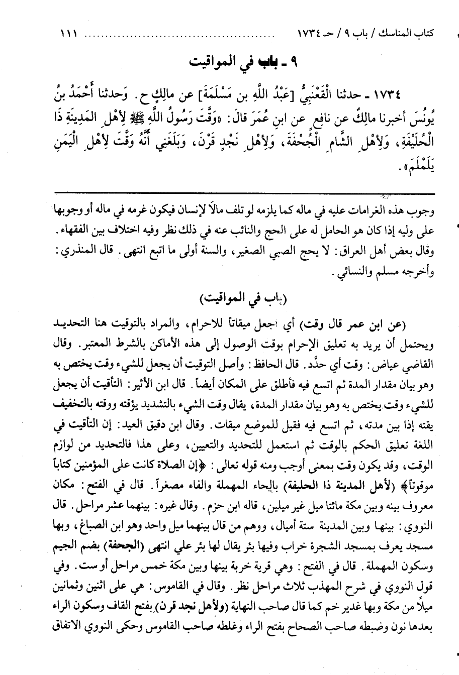 وقال بن دَقِيقِ الْعِيدِ إِنَّ التَّأْقِيتَ فِي اللُّغَةِ تَعْلِيقُ الْحُكْمِ بِالْوَقْتِ ثُمَّ اسْتُعْمِلَ لِلتَّحْدِيدِ وَالتَّعْيِينِ وَعَلَى هَذَا فَالتَّحْدِيدُ مِنْ لَوَازِمِ الْوَقْتِ وَقَدْ يَكُونُ وَقَّتَ بِمَعْنَى أَوْجَبَ وَمِنْهُ قَوْلُهُ تَعَالَى إِنَّ الصَّلَاةَ كَانَتْ عَلَى الْمُؤْمِنِينَ كِتَابًا مَوْقُوتًا (لِأَهْلِ الْمَدِينَةِ ذَا الْحُلَيْفَةِ) بِالْحَاءِ الْمُهْمَلَةِ وَالْفَاءِ مُصَغَّرًا