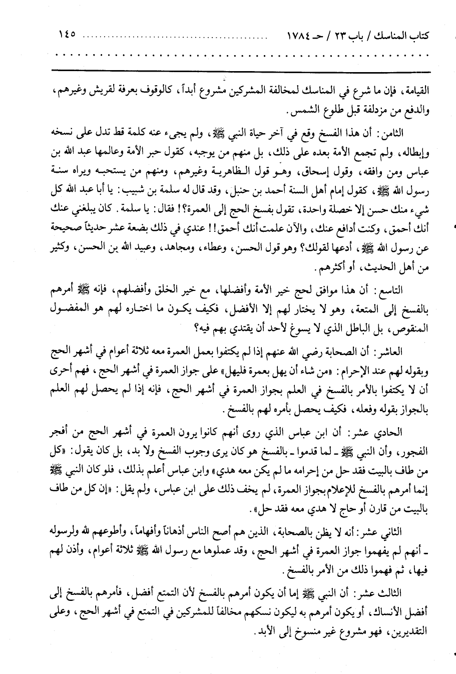 الثَّامِن أَنَّ هَذَا الْفَسْخ وَقَعَ فِي آخِر حَيَاة النبي ولم يجيء عَنْهُ كَلِمَة قَطّ تَدُلّ عَلَى نَسْخه وَإِبْطَاله وَلَمْ تُجْمِع الْأُمَّة بَعْده عَلَى ذَلِكَ بَلْ مِنْهُمْ مَنْ يُوجِبهُ كَقَوْلِ حَبْر الْأُمَّة وَعَالِمهَا عَبْد اللَّه بْن عَبَّاس وَمَنْ وَافَقَهُ وَقَوْل إِسْحَاق وَهُوَ قَوْل الظَّاهِرِيَّة وَغَيْرهمْ وَمِنْهُمْ مَنْ يستحبه ويراه سنة رسول الله كَقَوْلِ إِمَام أَهْل السُّنَّة أَحْمَد بْن حَنْبَل وَقَدْ قَالَ لَهُ سَلَمَة بْن شَبِيب يَا أَبَا عَبْد اللَّه كُلّ شَيْء مِنْك حَسَن إِلَّا خَصْلَة وَاحِدَة تَقُول بِفَسْخِ الْحَجّ إِلَى الْعُمْرَة فَقَالَ يَا سَلَمَة