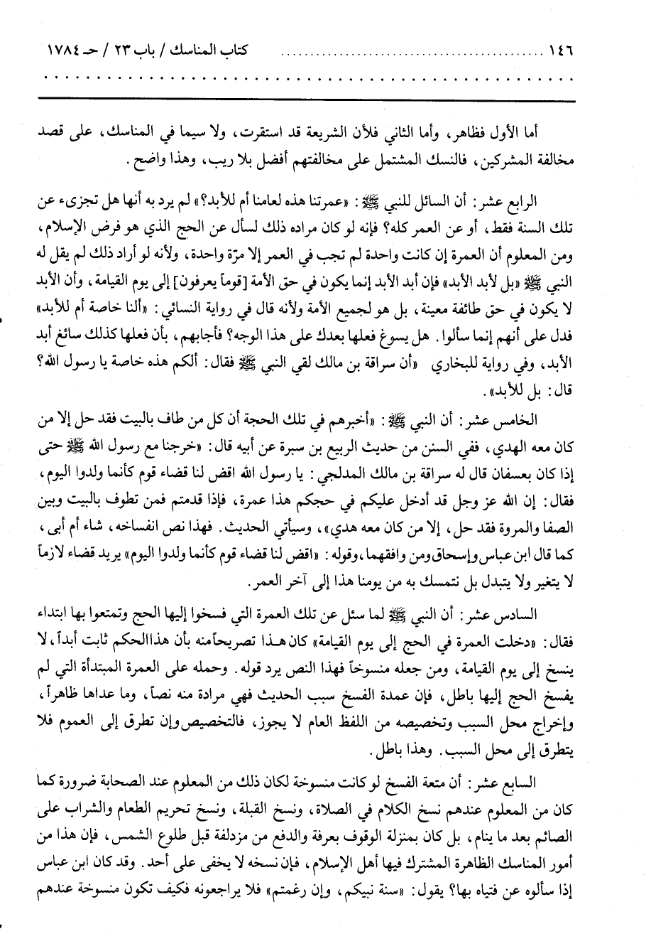 السادس عشر أن النبي لَمَّا سُئِلَ عَنْ تِلْكَ الْعُمْرَة الَّتِي فَسَخُوا إِلَيْهَا الْحَجّ وَتَمَتَّعُوا بِهَا اِبْتِدَاء فَقَالَ دَخَلَتْ الْعُمْرَة فِي الْحَجّ إِلَى يَوْم الْقِيَامَة كَانَ هَذَا تَصْرِيحًا مِنْهُ بِأَنَّ هَذَا الْحُكْم ثَابِت أَبَدًا لَا يُنْسَخ إِلَى يَوْم الْقِيَامَة وَمَنْ جَعَلَهُ مَنْسُوخًا فَهَذَا النَّصّ يَرُدّ قَوْله