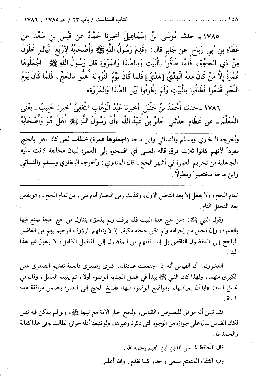 وقول النبي مَنْ حَجَّ هَذَا الْبَيْت فَلَمْ يَرْفُث وَلَمْ يَفْسُق يَتَنَاوَل مَنْ حَجَّ حَجَّة تَمَتَّعَ فِيهَا بِالْعُمْرَةِ وَإِنْ تَحَلَّلَ مِنْ إِحْرَامه وَلَمْ تَكُنْ حجته مكية إذ لا ينقلهم الرؤوف الرَّحِيم بِهِمْ مِنْ الْفَاضِل الرَّاجِح إِلَى الْمَفْضُول النَّاقِص بَلْ إِنَّمَا نَقَلَهُمْ مِنْ الْمَفْضُول إِلَى الْفَاضِل الْكَامِل لَا يَجُوز غَيْر هَذَا الْبَتَّة