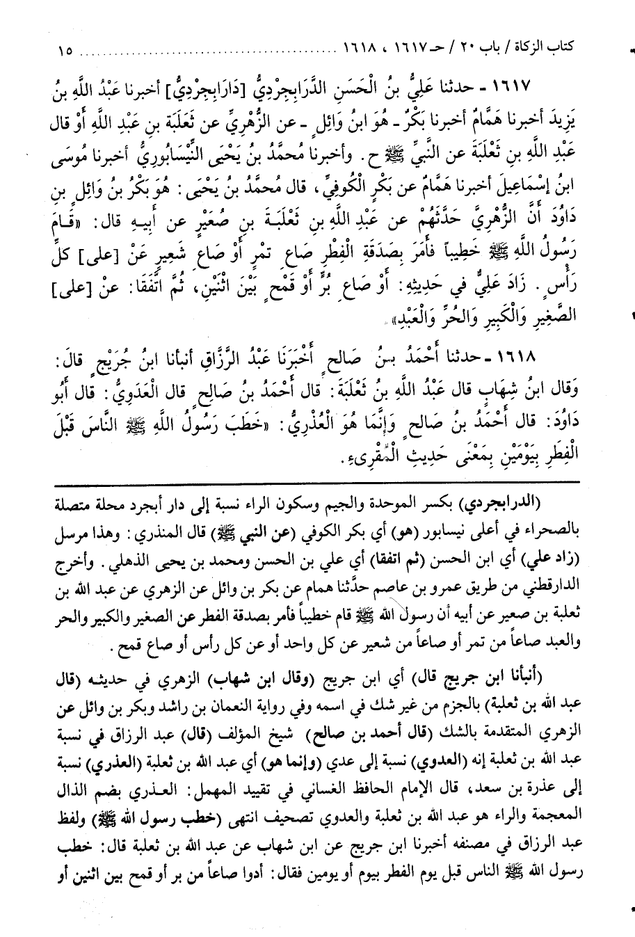 [1621] (أَنْبَأَنَا بن جريج قال) أي بن جريج (وقال بن شِهَابٍ) الزُّهْرِيُّ فِي حَدِيثِهِ (قَالَ عَبْدُ اللَّهِ بْنُ ثَعْلَبَةَ) بِالْجَزْمِ مِنْ غَيْرِ شَكٍّ فِي اسْمِهِ وَفِي رِوَايَةِ النُّعْمَانِ بْنِ رَاشِدٍ وَبَكْرِ بْنِ وَائِلٍ عَنِ الزُّهْرِيِّ الْمُتَقَدِّمَةِ بِالشَّكِّ (قَالَ أَحْمَدُ بْنُ صَالِحٍ) شَيْخُ الْمُؤَلِّفِ (قَالَ) عَبْدُ الرَّزَّاقِ فِي نِسْبَةِ عَبْدِ اللَّهِ بْنِ ثَعْلَبَةَ إِنَّهُ (الْعَدَوِيُّ) نِسْبَةً إِلَى عَدِيٍّ (وَإِنَّمَا هُوَ) أَيْ عَبْدُ اللَّهِ بْنُ ثَعْلَبَةَ (الْعُذْرِيُّ) نِسْبَةً إِلَى عُذْرَةَ بْنِ سَعْدٍ قَالَ الْإِمَامُ الْحَافِظُ الغساني في تقييد المهمل العذري بضم الذال الْمُعْجَمَةِ وَالرَّاءِ هُوَ عَبْدُ اللَّهِ بْنُ ثَعْلَبَةَ وَالْعَدَوِيُّ تَصْحِيفٌ انْتَهَى (خَطَبَ رَسُولُ اللَّهِ صَلَّى اللَّهُ عَلَيْهِ وَسَلَّمَ) وَلَفْظُ عَبْدِ الرَّزَّاقِ فِي مصنفه أخبرنا بن جريج عن بن شِهَابٍ عَنْ عَبْدِ اللَّهِ بْنِ ثَعْلَبَةَ قَالَ خَطَبَ رَسُولُ اللَّهِ صَلَّى اللَّهُ عَلَيْهِ وَسَلَّمَ النَّاسَ قَبْلَ يَوْمِ الْفِطْرِ بِيَوْمٍ أَوْ يَوْمَيْنِ فَقَالَ أَدُّوا صَاعًا مِنْ بُرٍّ أَوْ قَمْحٍ بَيْنَ اثْنَيْنِ أَوْ