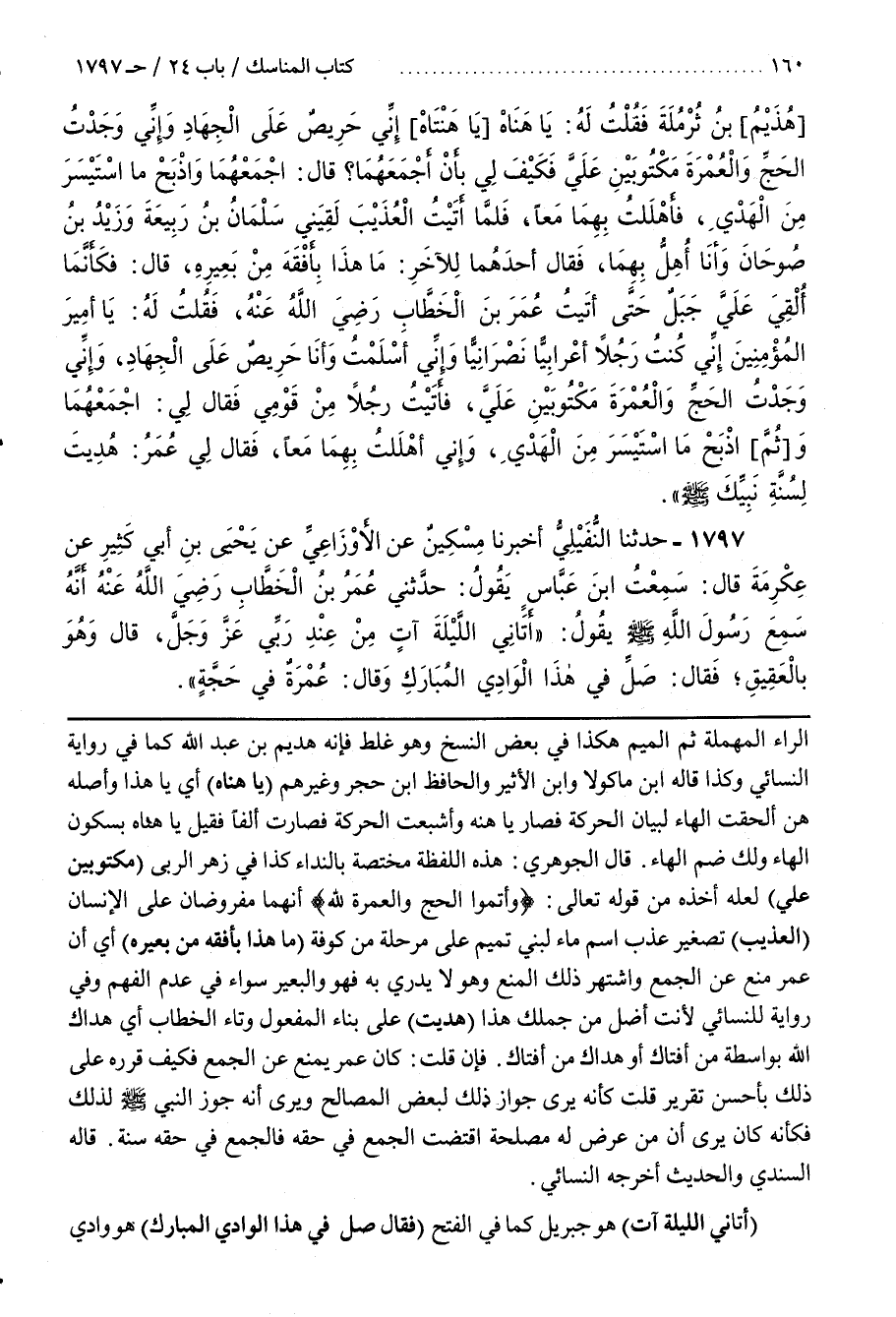 قَالَ الْجَوْهَرِيُّ هذه اللفظة مختص بِالنِّدَاءِ كَذَا فِي زَهْرِ الرُّبَى (مَكْتُوبَيْنِ عَلَى) لَعَلَّهُ أَخَذَهُ مِنْ قَوْلِهِ تَعَالَى وَأَتِمُّوا الْحَجَّ والعمرة لله أَنَّهُمَا مَفْرُوضَانِ عَلَى الْإِنْسَانِ (الْعُذَيْبَ) تَصْغِيرُ عَذْبٍ اسْمُ مَاءٍ لِبَنِي تَمِيمٍ عَلَى مَرْحَلَةٍ مِنْ كُوفَةَ (مَا هَذَا بِأَفْقَهَ مِنْ بَعِيرِهِ) أَيْ أَنَّ عُمَرَ مَنَعَ عَنِ الجَمْعِ وَاشْتُهِرَ ذَلِكَ الْمَنْعُ وَهُوَ لَا يَدْرِي بِهِ فَهُوَ وَالْبَعِيرُ سَوَاءٌ فِي عَدَمِ الْفَهْمِ وَفِي رِوَايَةٍ لِلنَّسَائِيِّ لَأَنْتَ أَضَلُّ مِنْ جَمَلِكَ مِنْ هَذَا (هُدِيتَ) عَلَى بِنَاءِ الْمَفْعُولِ وَتَاءِ الْخِطَابِ أَيْ هَدَاكَ اللَّهُ بِوَاسِطَةِ مَنْ أَفْتَاكَ أَوْ هَدَاكَ مَنْ أَفْتَاكَ