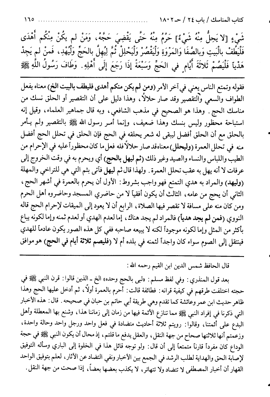 ــــــــــــQقال الحافظ شمس الدين بن القيم رحمه اللَّه بَعْد قَوْل الْمُنْذِرِيِّ وَفِي لَفْظ مُسْلِم لَبَّى بِالْحَجِّ وَحْده إِلَخْ الَّذِينَ قَالُوا قَرَنَ النَّبِيّ صَلَّى اللَّه عَلَيْهِ وَسَلَّمَ فِي حَجَّته اِخْتَلَفَتْ طُرُقهمْ فِي كَيْفِيَّة قِرَانه فَطَائِفَة قَالَتْ أَحْرَمَ بِالْعُمْرَةِ أَوَّلًا ثُمَّ أَدْخَلَ عَلَيْهَا الْحَجّ وهذا ظاهر حديث بن عُمَر وَعَائِشَة كَمَا تَقَدَّمَ وَهِيَ طَرِيقَة أَبِي حَاتِم بْن حِبَّانَ فِي صَحِيحه