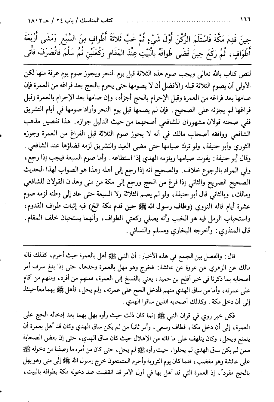 ــــــــــــQقَالَ وَالْفَصْل بَيْن الْجَمْع فِي هَذِهِ الْأَخْبَار أَنَّ النَّبِيّ صَلَّى اللَّه عَلَيْهِ وَسَلَّمَ أَهَلَّ بِالْعُمْرَةِ حَيْثُ أَحْرَمَ كَذَلِكَ قَالَهُ مَالِك عَنْ الزُّهْرِيِّ عَنْ عُرْوَة عَنْ عَائِشَة فَخَرَجَ وَهُوَ مُهِلّ بِالْعُمْرَةِ وَحْدهَا حَتَّى إِذَا بَلَغَ سَرِف أَمَرَ أَصْحَابه بِمَا ذَكَرْنَا فِي خَبَر أَفْلَح بْن حُمَيْدٍ يَعْنِي بِالْفَسْخِ إِلَى الْعُمْرَة فَمِنْهُمْ مَنْ أَفْرَدَ وَمِنْهُمْ مَنْ أَقَامَ عَلَى عُمْرَته وَأَمَّا مَنْ سَاقَ الْهَدْي مِنْهُمْ فَأَدْخَلَ الْحَجّ عَلَى عُمْرَته وَلَمْ يُحِلّ فَأَهَلَّ صَلَّى اللَّه عَلَيْهِ وَسَلَّمَ بِهِمَا مَعًا حِينَئِذٍ إِلَى أَنْ دَخَلَ مَكَّة