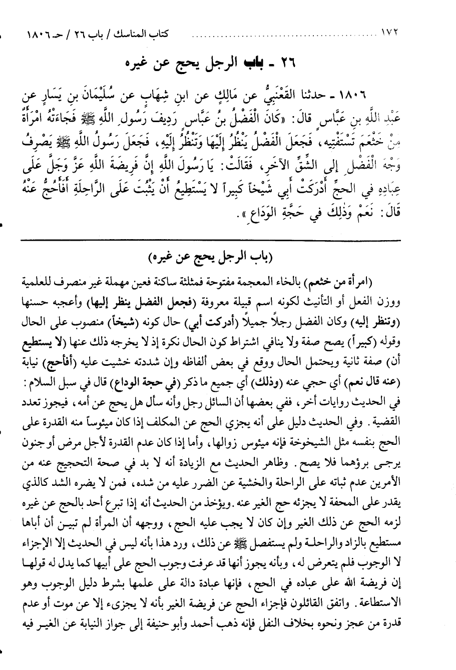 [1809] (امْرَأَةٌ مِنْ خَثْعَمَ) بِالْخَاءِ الْمُعْجَمَةِ مَفْتُوحَةً فَمُثَلَّثَةٍ سَاكِنَةٍ فَعَيْنٍ مُهْمَلَةٍ غَيْرُ مُنْصَرِفٍ لِلْعَلَمِيَّةِ وَوَزْنِ الْفِعْلِ أَوِ التَّأْنِيثِ لِكَوْنِهِ اسْمَ قَبِيلَةٍ مَعْرُوفَةٍ (فَجَعَلَ الْفَضْلُ يَنْظُرُ إِلَيْهَا) وَأَعْجَبَهُ حُسْنُهَا (وَتَنْظُرُ إِلَيْهِ) وَكَانَ الْفَضْلُ رَجُلًا جَمِيلًا (أَدْرَكَتْ أَبِي) حَالَ كَوْنِهِ (شَيْخًا) مَنْصُوبٌ عَلَى الْحَالِ وَقَوْلُهُ (كَبِيرًا) يَصِحُّ صِفَةً وَلَا يُنَافِي اشْتِرَاطَ كَوْنِ الْحَالِ نَكِرَةً إذا لَا يُخْرِجُهُ ذَلِكَ عَنْهَا (لَا يَسْتَطِيعُ أَنْ) صِفَةٌ ثَانِيَةٌ وَيُحْتَمَلُ الْحَالُ وَوَقَعَ فِي بَعْضِ أَلْفَاظِهِ وَإِنْ شَدَدْتُهُ خَشِيتُ عَلَيْهِ (أَفَأَحُجُّ) نِيَابَةً (عَنْهُ قَالَ نَعَمْ) أَيْ حُجِّي عَنْهُ (وَذَلِكَ) أَيْ جَمِيعُ مَا ذُكِرَ (فِي حَجَّةِ الْوَدَاعِ) قَالَ فِي سُبُلِ السَّلَامِ فِي الْحَدِيثِ رِوَايَاتٌ أُخَرُ فَفِي بَعْضِهَا أَنَّ السَّائِلَ رَجُلٌ وَأَنَّهُ سَأَلَ هَلْ يَحُجُّ عَنْ أُمِّهِ فَيَجُوزُ تَعَدُّدُ الْقَضِيَّةِ