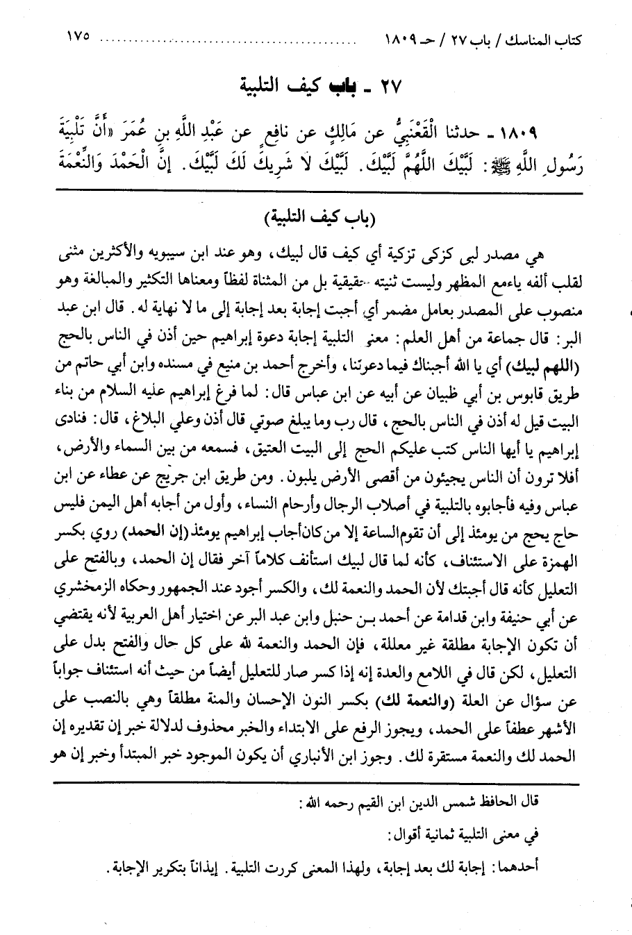 ــــــــــــQقال الحافظ شمس الدين بن القيم رحمه اللَّه فِي مَعْنَى التَّلْبِيَة ثَمَانِيهِ أَقْوَال أَحَدهمَا إِجَابَة لَك بَعْد إِجَابَة وَلِهَذَا الْمَعْنَى كُرِّرَتْ التَّلْبِيَة إِيذَانًا بِتَكْرِيرِ الْإِجَابَة