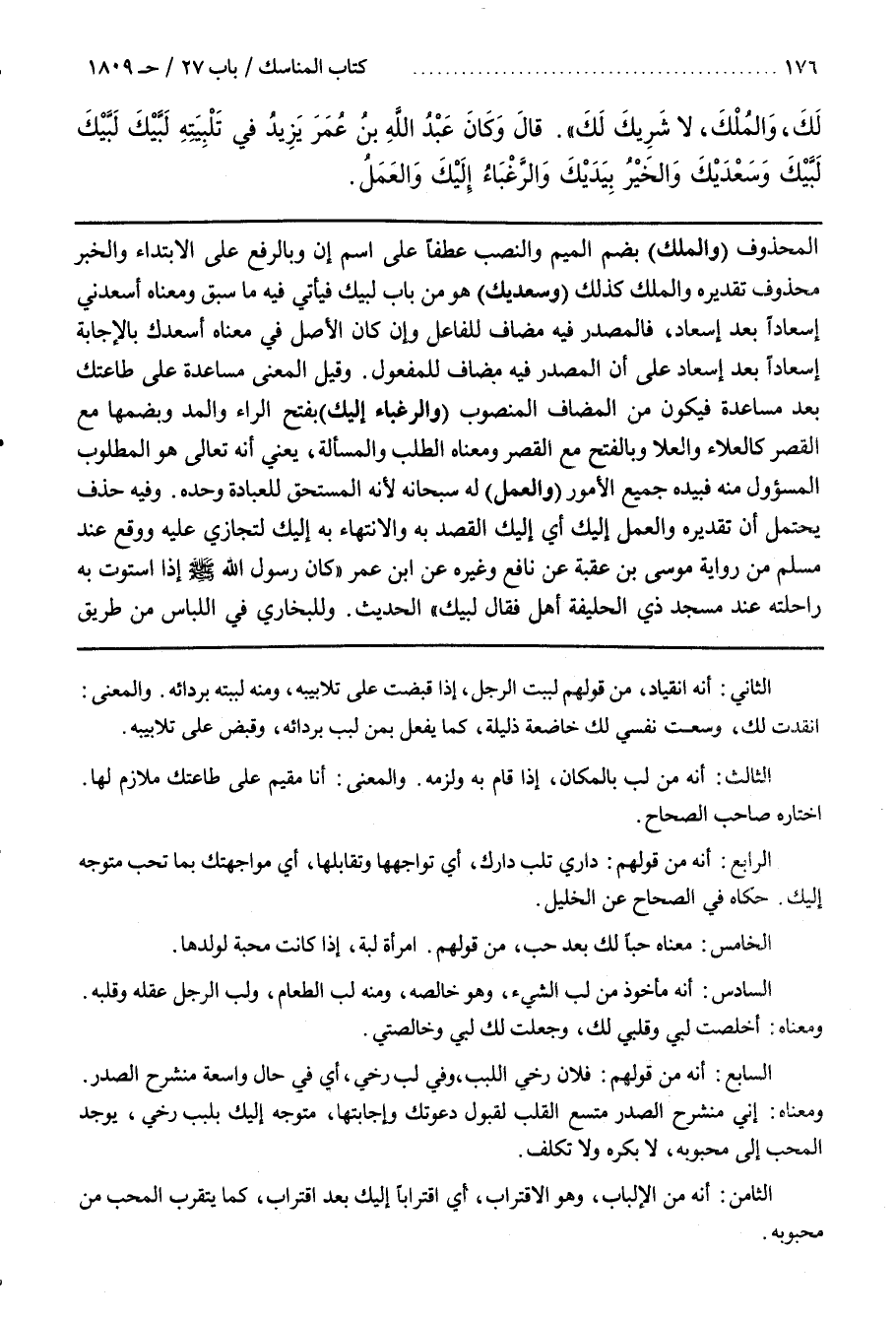 وفي حَذْفٌ يُحْتَمَلُ أَنَّ تَقْدِيرَهُ وَالْعَمَلُ إِلَيْكَ أَيْ إِلَيْكَ الْقَصْدُ بِهِ وَالِانْتِهَاءُ بِهِ إِلَيْكَ لِتُجَازِيَ عَلَيْهِ وَوَقَعَ عِنْدَ مُسْلِمٍ مِنْ رِوَايَةِ مُوسَى بن عقبة عن نافع وغيره عن بن عُمَرَ كَانَ رَسُولُ اللَّهِ صَلَّى اللَّهُ عَلَيْهِ وَسَلَّمَ إِذَا اسْتَوَتْ بِهِ رَاحِلَتُهُ عِنْدَ مَسْجِدِ ذِي الْحُلَيْفَةِ أَهَلَّ فَقَالَ لَبَّيْكَ الْحَدِيثَ