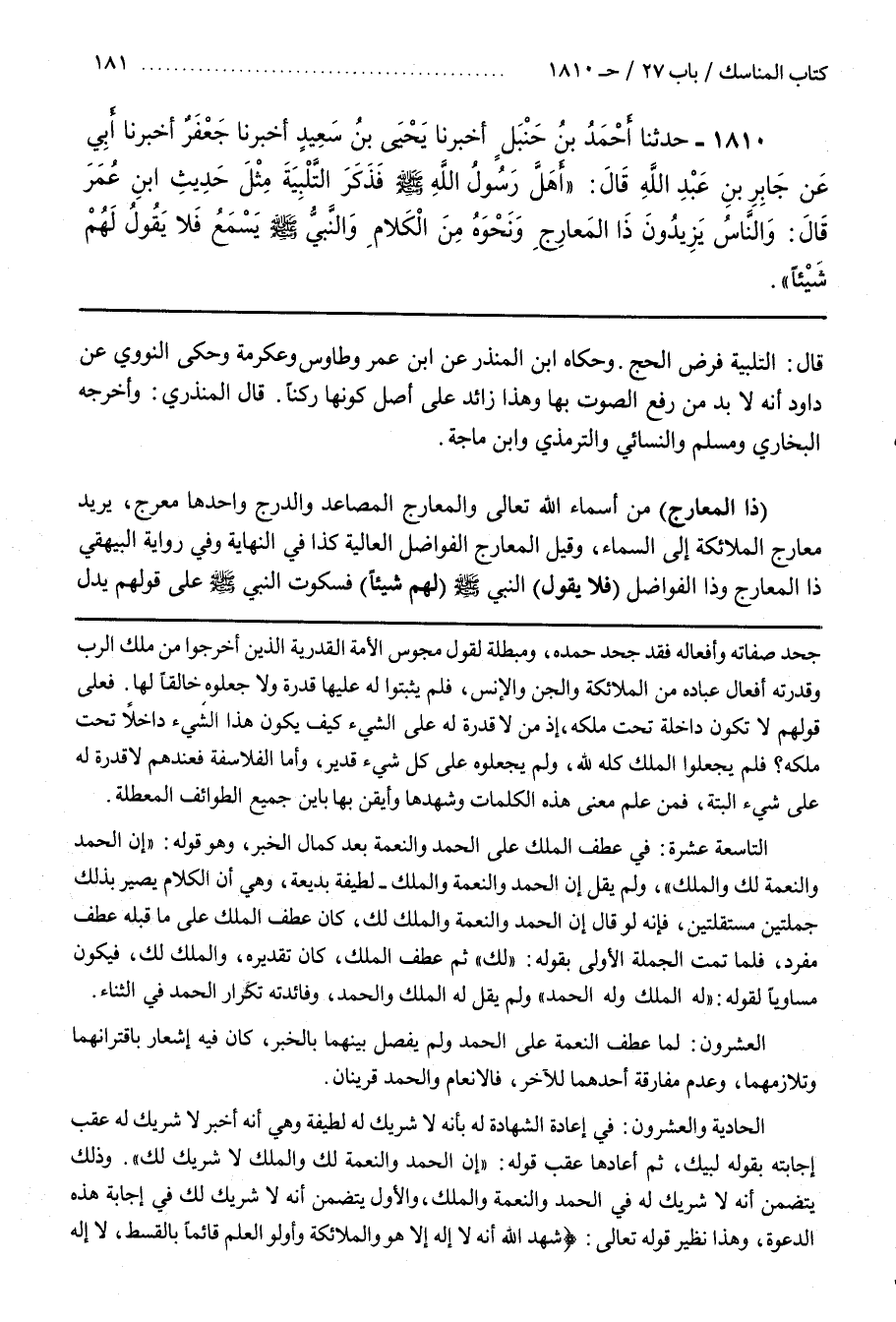 [1813] (ذَا الْمَعَارِجِ) مِنْ أَسْمَاءِ اللَّهِ تَعَالَى وَالْمَعَارِجُ الْمَصَاعِدُ وَالدَّرَجُ وَاحِدُهَا مَعْرَجٌ يُرِيدُ مَعَارِجَ الْمَلَائِكَةِ إِلَى السَّمَاءِ وَقِيلَ الْمَعَارِجُ الْفَوَاضِلُ الْعَالِيَةُ كَذَا فِي النِّهَايَةِ وَفِي رِوَايَةِ الْبَيْهَقِيِّ ذَا الْمَعَارِجِ وَذَا الْفَوَاضِلِ (فَلَا يَقُولُ) النَّبِيُّ صَلَّى اللَّهُ عَلَيْهِ وَسَلَّمَ (لَهُمْ شَيْئًا) فَسُكُوتُ النَّبِيِّ صَلَّى اللَّهُ عَلَيْهِ وَسَلَّمَ عَلَى قَوْلِهِمْ يَدُلُّ على جواز الزيادة على التلبية المعنية ويدل