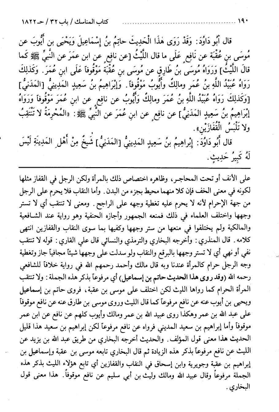 قَالَ الْمُنْذِرِيُّ وَأَخْرَجَهُ الْبُخَارِيُّ وَالتِّرْمِذِيُّ والنسائي قال علي القارىء قَوْلُهُ لَا تَنْتَقِبْ نَفْيٌ أَوْ نَهْيٌ أَيْ لَا تَسْتُرْ وَجْهَهَا بِالْبُرْقُعِ وَالنِّقَابِ وَلَوْ سَدَلَتْ عَلَى وَجْهِهَا شَيْئًا مُجَافِيًا جَازَ وَتَغْطِيَةُ وَجْهِ الرجل حَرَامٌ كَالْمَرْأَةِ عِنْدَنَا وَبِهِ قَالَ مَالِكٌ وَأَحْمَدُ رَحِمَهُمُ اللَّهُ فِي رِوَايَةٍ خِلَافًا لِلشَّافِعِيِّ رَحِمَهُ اللَّهُ (وَقَدْ رَوَى هَذَا الْحَدِيثَ حَاتِمُ بْنُ إِسْمَاعِيلَ) أَيْ مَرْفُوعًا بِذِكْرِ هَذِهِ الْجُمْلَةِ وَلَا تَنْتَقِبِ الْمَرْأَةُ الْحَرَامُ كَمَا رَوَاهَا اللَّيْثُ لَكِنِ اخْتُلِفَ عَلَى مُوسَى بْنِ عُقْبَةَ فَرَوَى حَاتِمُ بْنُ إِسْمَاعِيلَ وَيَحْيَى بْنُ أَيُّوبَ عَنْهُ عَنْ نَافِعٍ مَرْفُوعًا كَمَا قَالَ اللَّيْثُ وَرَوَى مُوسَى بْنُ طَارِقٍ عَنْهُ عَنْ نَافِعٍ مَوْقُوفًا عَلَى عَبْدِ اللَّهِ بْنِ عَمْرَ وَهَكَذَا رَوَى عُبَيْدُ اللَّهِ بْنُ عُمَرَ وَمَالِكٌ وَأَيُّوبُ كُلُّهُمْ عَنْ نافع عن بن عُمَرَ مَوْقُوفًا وَأَمَّا إِبْرَاهِيمُ بْنُ سَعِيدٍ الْمَدِينِيُّ فَرَوَاهُ عَنْ نَافِعٍ مَرْفُوعًا لَكِنْ إِبْرَاهِيمُ بْنُ سَعِيدٍ هَذَا قَلِيلُ الْحَدِيثِ هَذَا مَعْنَى قَوْلِ الْمُؤَلِّفِ