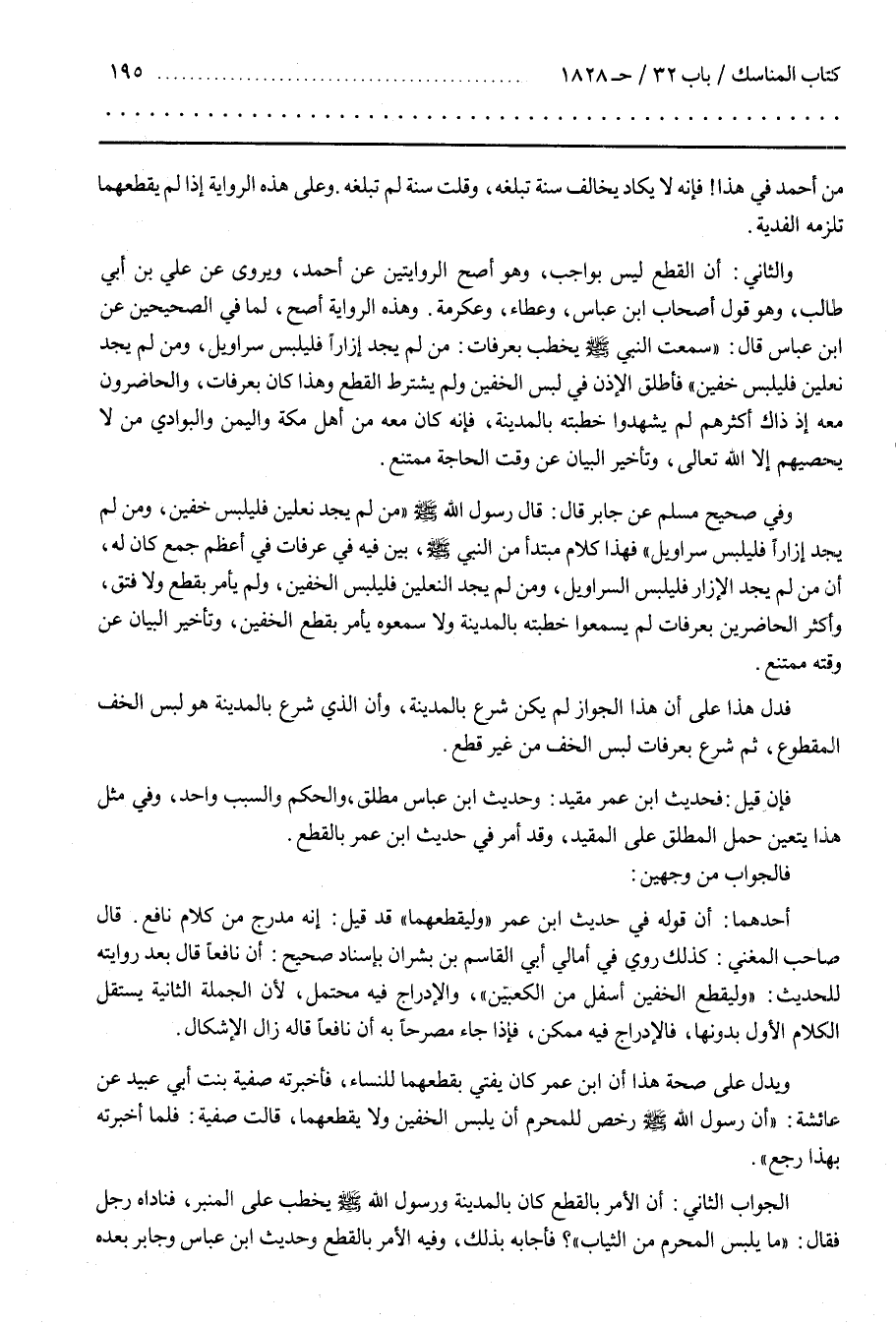 وَفِي صَحِيح مُسْلِم عَنْ جَابِر قَالَ قَالَ رَسُول اللَّه صَلَّى اللَّه عَلَيْهِ وَسَلَّمَ مَنْ لَمْ يَجِد نَعْلَيْنِ فَلْيَلْبَسْ خُفَّيْنِ وَمَنْ لَمْ يَجِد إِزَارًا فَلْيَلْبَسْ سَرَاوِيل فَهَذَا كَلَام مُبْتَدَأ مِنْ النَّبِيّ صَلَّى اللَّه عَلَيْهِ وَسَلَّمَ بَيَّنَ فِيهِ فِي عَرَفَات فِي أَعْظَم جَمْع كَانَ لَهُ أَنَّ مَنْ لَمْ يَجِد الْإِزَار فَلْيَلْبَسْ السَّرَاوِيل وَمَنْ لَمْ يَجِد النَّعْلَيْنِ فَلْيَلْبَسْ الْخُفَّيْنِ وَلَمْ يَأْمُر بِقَطْعِ وَلَا فَتْق وَأَكْثَر الْحَاضِرِينَ بِعَرَفَاتٍ لَمْ يَسْمَعُوا خُطْبَته بِالْمَدِينَةِ وَلَا سَمِعُوهُ يَأْمُر بِقَطْعِ الْخُفَّيْنِ وَتَأْخِير الْبَيَان عَنْ وَقْته مُمْتَنِع