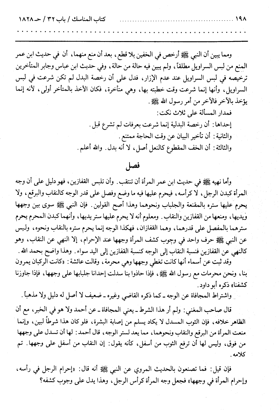 ــــــــــــQوَمِمَّا يُبَيِّن أَنَّ النَّبِيّ صَلَّى اللَّه عَلَيْهِ وَسَلَّمَ أَرْخَصَ فِي الْخُفَّيْنِ بِلَا قَطْع بَعْد أَنْ مَنَعَ مِنْهُمَا أَنَّ فِي حَدِيث بن عُمَر الْمَنْع مِنْ لِبْس السَّرَاوِيل مُطْلَقًا وَلَمْ يُبَيِّن فِيهِ حَالَةً مِنْ حَالَةٍ وَفِي حَدِيث بن عَبَّاس وَجَابِر الْمُتَأَخِّرِينَ تَرْخِيصه فِي لِبْس السَّرَاوِيل عِنْد عَدَم الْإِزَار فَدَلَّ عَلَى أَنَّ رُخْصَة الْبَدَل لَمْ تَكُنْ شُرِعَتْ فِي لِبْس السَّرَاوِيل وَأَنَّهَا إِنَّمَا شُرِعَتْ وَقْت خَطَبَتْهُ بِهَا وَهِيَ مُتَأَخِّرَة فَكَانَ الْأَخْذ بِالْمُتَأَخِّرِ أَوْلَى لِأَنَّهُ إِنَّمَا يُؤْخَذ بِالْآخِرِ فَالْآخِر مِنْ أَمْر رَسُول اللَّه صَلَّى اللَّه عَلَيْهِ وَسَلَّمَ