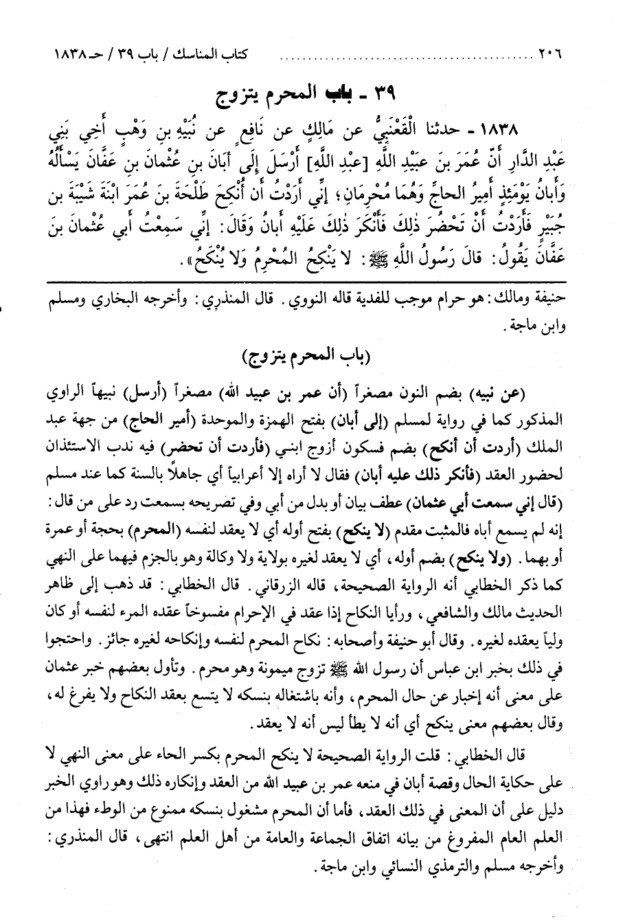 [1841] (عَنْ نُبَيْهٍ) بِضَمِّ النُّونِ مُصَغَّرًا (أَنَّ عُمَرَ بْنَ عُبَيْدِ اللَّهِ مُصَغَّرًا (أَرْسَلَ) نُبَيْهًا الرَّاوِيَ الْمَذْكُورَ فِي رِوَايَةٍ لِمُسْلَمٍ (إِلَى أَبَانَ) بِفَتْحِ الْهَمْزَةِ وَالْمُوَحَّدَةِ (أَمِيرُ الْحَاجِّ) مِنْ جِهَةِ عَبْدِ الْمَلِكِ (أَرَدْتُ أَنْ أُنْكِحَ) بِضَمٍّ فَسُكُونٍ أُزَوِّجَ ابْنِي (فَأَرَدْتُ أَنْ تَحْضُرَ) فيه ندب الاستئذان لحضور العقد (فَأَنْكَرَ ذَلِكَ عَلَيْهِ أَبَانُ) فَقَالَ لَا أَرَاهُ إِلَّا أَعْرَابِيًّا أَيْ جَاهِلًا بِالسُّنَّةِ كَمَا عِنْدَ مُسْلِمٍ (قَالَ إِنِّي سَمِعْتُ أَبِي عُثْمَانَ) عَطْفُ بَيَانٍ أَوْ بَدَلٌ مِنْ أَبِي وَفِي تَصْرِيحِهِ بِسَمِعْتُ رَدٌّ عَلَى مَنْ قَالَ إِنَّهُ لَمْ يَسْمَعْ أَبَاهُ فَالْمُثْبَتُ مُقَدَّمٌ (لَا يَنْكِحُ) بِفَتْحِ أَوَّلِهِ أَيْ لَا يَعْقِدُ لِنَفْسِهِ (الْمُحْرِمُ) بِحَجٍّ أَوْ عُمْرَةٍ أَوْ بِهِمَا (وَلَا يُنْكِحُ) بِضَمِّ أَوَّلِهِ أَيْ لَا يَعْقِدُ لِغَيْرِهِ بِوِلَايَةٍ وَلَا وَكَالَةٍ وَهُوَ بِالْجَزْمِ فِيهِمَا عَلَى النَّهْيِ كَمَا ذَكَرَ الْخَطَّابِيُّ أَنَّهُ الرِّوَايَةُ الصَّحِيحَةُ قَالَهُ الزُّرْقَانِيُّ
