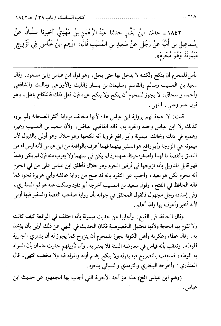 قُلْتُ لا حجة لهم برواية بن عباس هذه لأنها مخالف لِرِوَايَةِ أَكْثَرِ الصَّحَابَةِ وَلَمْ يَرْوِهِ كَذَلِكَ إِلَّا بن عَبَّاسٍ وَحْدَهُ وَانْفَرَدَ بِهِ قَالَهُ الْقَاضِي عِيَاضٌ وَلِأَنَّ سَعِيدَ بْنَ الْمُسَيَّبِ وَغَيْرَهُ وَهَّمُوهُ فِي ذَلِكَ وَخَالَفَتْهُ مَيْمُونَةُ وَأَبُو رَافِعٍ فَرَوَيَا أَنَّهُ نَكَحَهَا وَهُوَ حَلَالٌ وَهُوَ أَوْلَى بِالْقَبُولِ لِأَنَّ مَيْمُونَةَ هِيَ الزَّوْجَةُ وَأَبُو رَافِعٍ هُوَ السَّفِيرُ بينهما فهما أعرف بالواقعة من بن عَبَّاسٍ لِأَنَّهُ لَيْسَ لَهُ مِنَ التَّعَلُّقِ بِالْقِصَّةِ مالهما وَلِصِغَرِهِ حِينَئِذٍ عَنْهُمَا إِذْ لَمْ يَكُنْ فِي سِنِّهِمَا وَلَا يَقْرَبُ مِنْهُ فَإِنْ لَمْ يَكُنْ وَهْمًا فَهُوَ قَابِلٌ لِلتَّأْوِيلِ بِأَنَّهُ تَزَوَّجَهَا فِي أرض الحرم وهو حلال فأطلق بن عَبَّاسٍ عَلَى مَنْ فِي الْحَرَمِ أَنَّهُ مُحْرِمٌ لَكِنْ هُوَ بَعِيدٌ وَأُجِيبَ عَنِ التَّفَرُّدِ بِأَنَّهُ قَدْ صَحَّ مِنْ رِوَايَةِ عَائِشَةَ وَأَبِي هُرَيْرَةَ نَحْوُهُ كَمَا قَالَهُ الْحَافِظُ فِي الْفَتْحِ وَقَوْلُ سَعِيدِ بْنِ الْمُسَيَّبِ أَخْرَجَهُ أَبُو دَاوُدَ وَسَكَتَ عَنْهُ هُوَ ثُمَّ الْمُنْذِرِيُّ وَفِي إِسْنَادِهِ رَجُلٌ مَجْهُولٌ فَالْقَوْلُ الْمُحَقَّقُ فِي جَوَابِهِ بِأَنَّ رِوَايَةَ صَاحِبِ الْقِصَّةِ وَالسَّفِيرِ فِيهَا أَوْلَى لِأَنَّهُ أَخْبَرُ وَأَعْرَفُ بِهَا وَاللَّهُ أَعْلَمُ