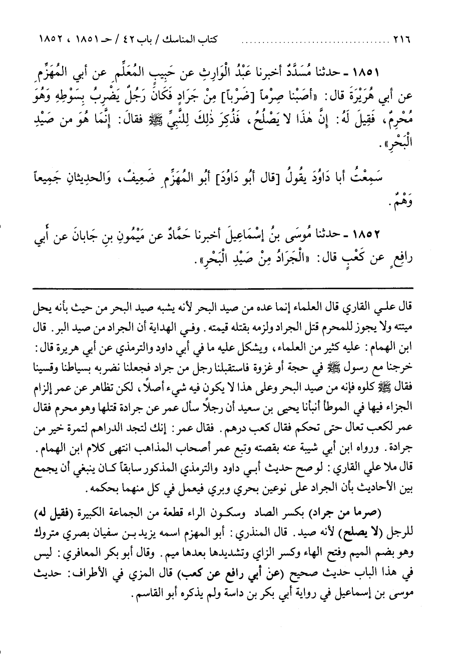 قال بن الْهُمَامِ عَلَيْهِ كَثِيرٌ مِنَ الْعُلَمَاءِ وَيُشْكِلُ عَلَيْهِ ما فيه أَبِي دَاوُدَ وَالتِّرْمِذِيِّ عَنْ أَبِي هُرَيْرَةَ قَالَ خَرَجْنَا مَعَ رَسُولِ اللَّهِ صَلَّى اللَّهُ عَلَيْهِ وَسَلَّمَ فِي حَجَّةٍ أَوْ غَزْوَةٍ فَاسْتَقْبَلَنَا رِجْلٌ مِنْ جَرَادٍ فَجَعَلْنَا نَضْرِبُهُ بِسِيَاطِنَا وَقِسِيِّنَا فَقَالَ صلى الله عليه وسلم كُلُوهُ فَإِنَّهُ مِنْ صَيْدِ الْبَحْرِ وَعَلَى هَذَا لَا يَكُونُ فِيهِ شَيْءٌ أَصْلًا لَكِنْ تَظَاهَرَ عَنْ عُمَرَ إِلْزَامُ الْجَزَاءِ فِيهَا فِي الْمُوَطَّأِ أَنْبَأَنَا يَحْيَى بْنُ سَعِيدٍ أَنَّ رَجُلًا سَأَلَ عُمَرَ عَنْ جَرَادَةٍ قَتَلَهَا وَهُوَ مُحْرِمٌ فَقَالَ عُمَرُ لِكَعْبٍ تَعَالَ حَتَّى تَحْكُمَ فَقَالَ كَعْبٌ دِرْهَمٌ