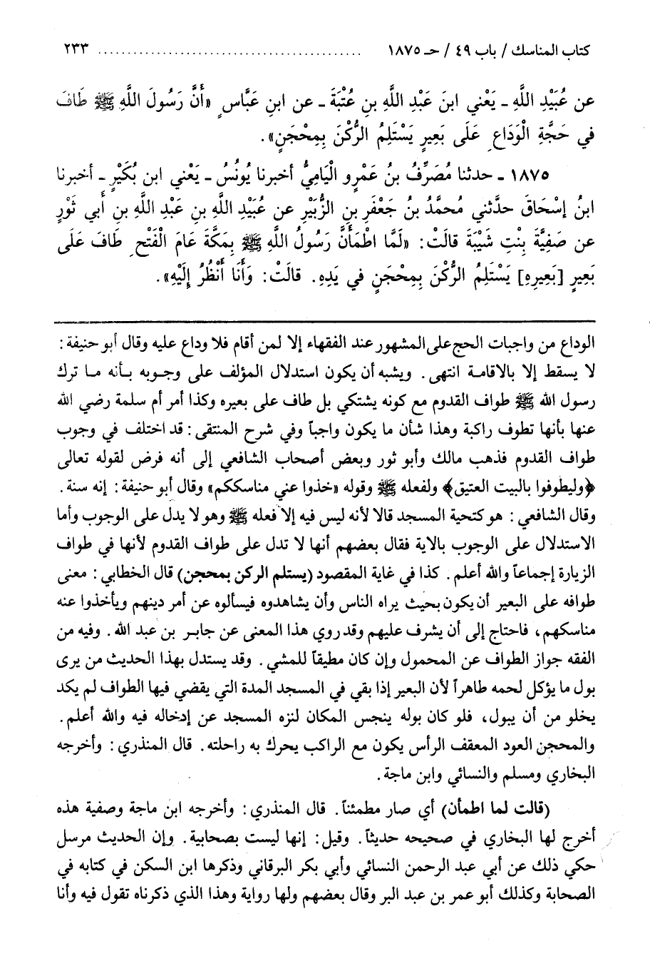 وَقَدْ يَسْتَدِلُّ بِهَذَا الْحَدِيثِ مَنْ يَرَى بَوْلَ مَا يُؤْكَلُ لَحْمُهُ طَاهِرًا لِأَنَّ الْبَعِيرَ إِذَا بَقِيَ فِي الْمَسْجِدِ الْمُدَّةَ الَّتِي يُقْضَى فِيهَا الطَّوَافُ لَمْ يَكَدْ يَخْلُو مِنْ أَنْ يَبُولَ فَلَوْ كَانَ بَوْلُهُ يُنَجِّسُ الْمَكَانَ لَنُزِّهَ الْمَسْجِدُ عَنْ إِدْخَالِهِ فِيهِ وَاللَّهُ أَعْلَمُ
