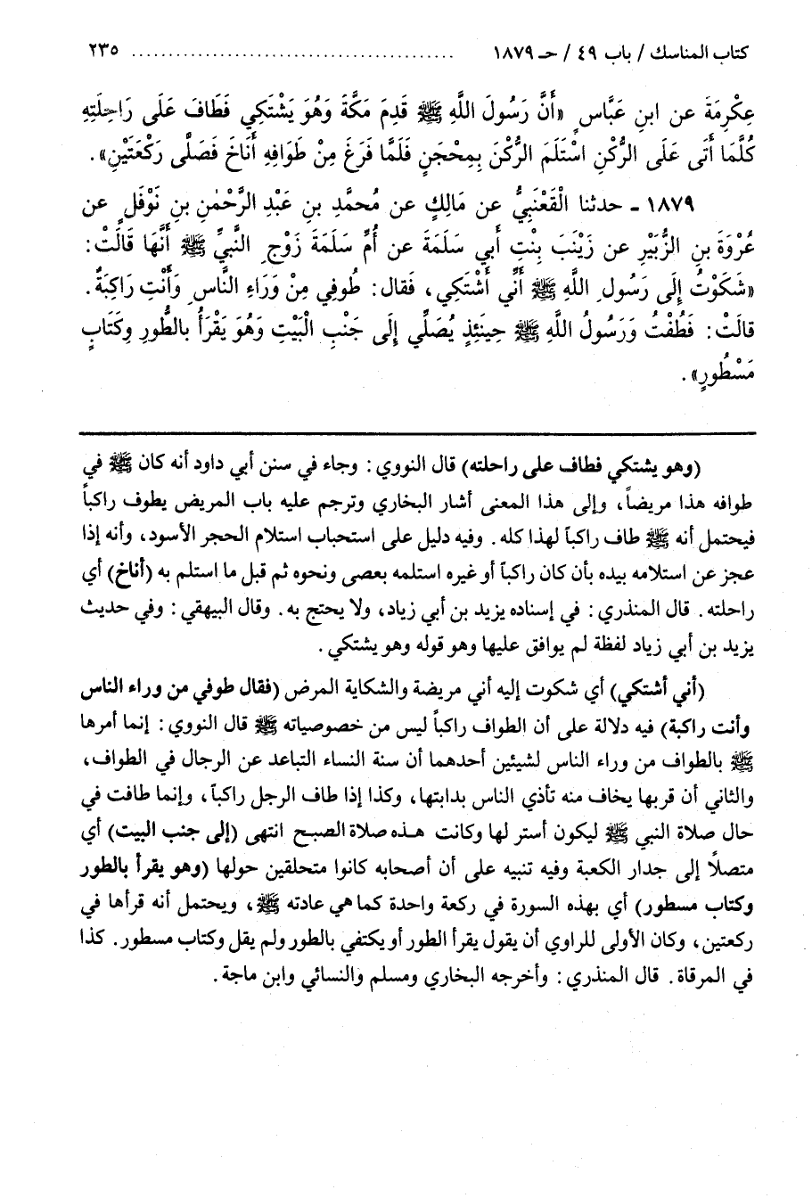 [1881] (وَهُوَ يَشْتَكِي فَطَافَ عَلَى رَاحِلَتِهِ) قَالَ النَّوَوِيُّ وَجَاءَ فِي سُنَنِ أَبِي دَاوُدَ أَنَّهُ كَانَ صَلَّى اللَّهُ عَلَيْهِ وَسَلَّمَ فِي طَوَافِهِ هَذَا مَرِيضًا وَإِلَى هَذَا الْمَعْنَى أَشَارَ الْبُخَارِيُّ وَتَرْجَمَ عَلَيْهِ بَابُ الْمَرِيضِ يَطُوفُ رَاكِبًا فَيُحْتَمَلُ أَنَّهُ صَلَّى اللَّهُ عَلَيْهِ وَسَلَّمَ طَافَ رَاكِبًا لِهَذَا كُلِّهِ