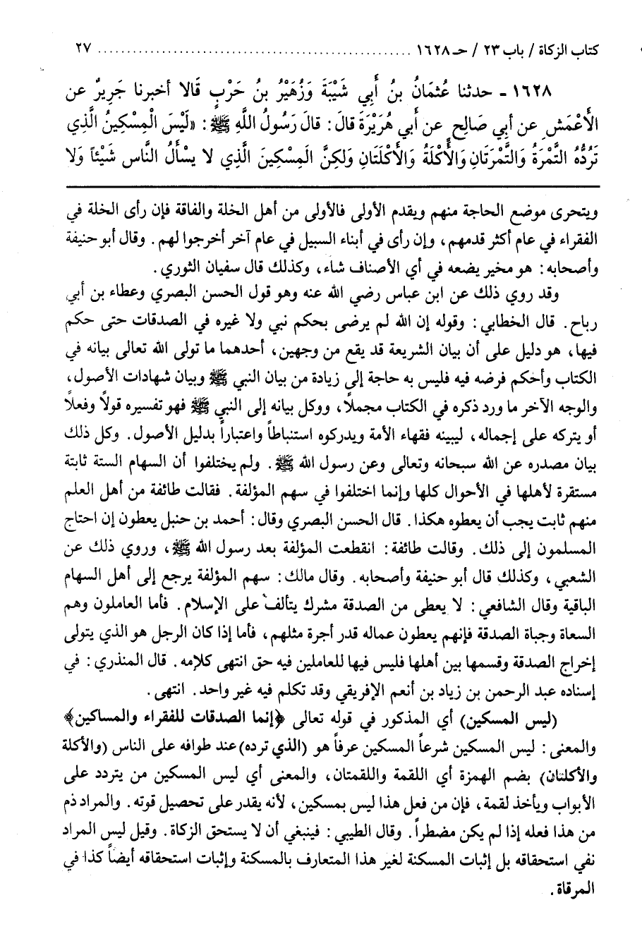 [1631] (لَيْسَ الْمِسْكِينُ) أَيِ الْمَذْكُورُ فِي قَوْلِهِ تَعَالَى إنما الصدقات للفقراء والمساكين وَالْمَعْنَى لَيْسَ الْمِسْكِينُ شَرْعًا الْمِسْكِينُ عُرْفًا هُوَ (الَّذِي تَرُدُّهُ) عِنْدَ طَوَافِهِ عَلَى النَّاسِ (وَالْأُكْلَةُ وَالْأُكْلَتَانِ) بِضَمِّ الْهَمْزَةِ أَيِ اللُّقْمَةُ وَاللَّقْمَتَانِ وَالْمَعْنَى أَيْ لَيْسَ الْمِسْكِينُ مَنْ يَتَرَدَّدُ عَلَى الْأَبْوَابِ وَيَأْخُذُ لُقْمَةً فَإِنَّ مَنْ فَعَلَ هَذَا لَيْسَ بِمِسْكِينٍ لِأَنَّهُ يَقْدِرُ عَلَى تَحْصِيلِ قُوتِهِ
