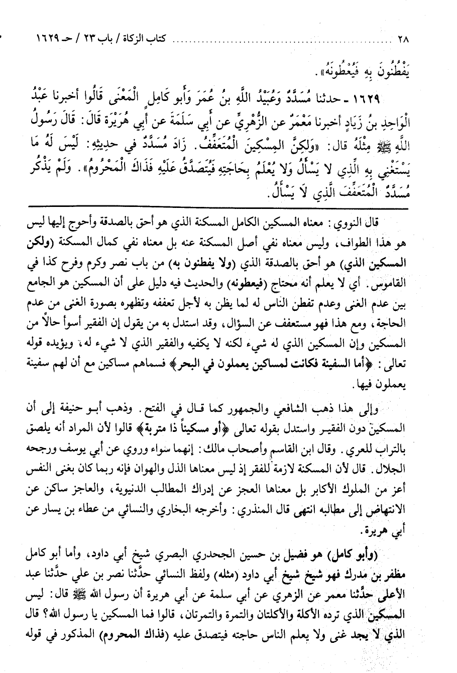 [1632] (وَأَبُو كَامِلٍ) هُوَ فُضَيْلُ بْنُ حُسَيْنٍ الْجَحْدَرِيُّ الْبَصْرِيُّ شَيْخُ أَبِي دَاوُدَ وَأَمَّا أَبُو كَامِلٍ مُظَفَّرُ بْنُ مُدْرِكٍ فَهُوَ شَيْخُ شَيْخِ أَبِي دَاوُدَ (مِثْلَهُ) وَلَفْظُ النَّسَائِيِّ حَدَّثَنَا نَصْرُ بْنُ عَلِيٍّ حَدَّثَنَا عَبْدُ الْأَعْلَى حَدَّثَنَا مَعْمَرٌ عَنِ الزُّهْرِيِّ عن أبي سلمة عن أبي هريرة أن رسول الله قَالَ لَيْسَ الْمِسْكِينُ الَّذِي تَرُدُّهُ الْأُكْلَةُ وَالْأُكْلَتَانِ والتمرة والتمرتان قالوا فما المسكين يارسول اللَّهِ قَالَ الَّذِي لَا يَجِدُ غِنًى وَلَا يَعْلَمُ النَّاسُ حَاجَتَهُ فَيُتَصَدَّقُ عَلَيْهِ (فَذَاكَ الْمَحْرُومُ) الْمَذْكُورُ فِي قَوْلِهِ