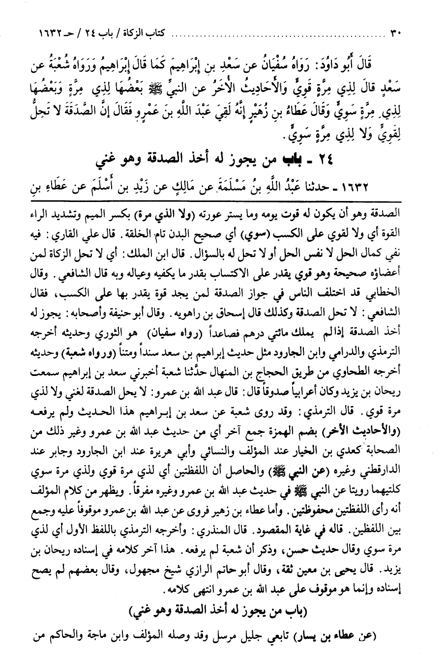 الصَّدَقَةِ وَهُوَ أَنْ يَكُونَ لَهُ قُوتُ يَوْمِهِ وَمَا يَسْتُرُ عَوْرَتَهُ (وَلَا لِذِي مِرَّةٍ) بِكَسْرِ الْمِيمِ وَتَشْدِيدِ الرَّاءِ الْقُوَّةِ أَيْ وَلَا لِقَوِيٍّ عَلَى الْكَسْبِ (سَوِيٍّ) أَيْ صَحِيحِ الْبَدَنِ تَامِّ الخلقة