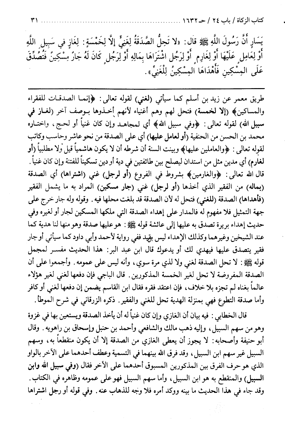 طَرِيقِ مَعْمَرٍ عَنْ زَيْدِ بْنِ أَسْلَمَ كَمَا سَيَأْتِي (لِغَنِيٍّ) لِقَوْلِهِ تَعَالَى إِنَّمَا الصَّدَقَاتُ لِلْفُقَرَاءِ والمساكين (إِلَّا لِخَمْسَةٍ) فَتَحِلُّ لَهُمْ وَهُمْ أَغْنِيَاءُ لِأَنَّهُمْ أَخَذُوهَا بِوَصْفٍ آخَرَ (لِغَازٍ فِي سَبِيلِ اللَّهِ) لقوله تعالى وفي سبيل الله أَيْ لِمُجَاهِدٍ وَإِنْ كَانَ غَنِيًّا أَوِ الْحَجِّ وَاخْتَارَهُ مُحَمَّدُ بْنُ الْحَسَنِ مِنَ الْحَنَفِيَّةِ (أَوْ لِعَامِلٍ عَلَيْهَا) أَيْ عَلَى الصَّدَقَةِ مِنْ نَحْوِ عَاشِرٍ وَحَاسِبٍ وَكَاتِبٍ لِقَوْلِهِ تَعَالَى وَالْعَامِلِينَ عَلَيْهَا وَبَيَّنَتِ السُّنَّةُ أَنَّ شَرْطَهُ أَنْ لَا يَكُونَ هَاشِمِيًّا قِيلَ وَلَا مُطَّلِبِيًّا (أَوْ لِغَارِمٍ) أَيْ مَدِينٍ مِثْلَ مَنِ اسْتَدَانَ لِيُصْلِحَ بَيْنَ طَائِفَتَيْنِ فِي دِيَةٍ أَوْ دَيْنٍ تَسْكِينًا لِلْفِتْنَةِ وَإِنْ كان غنيا