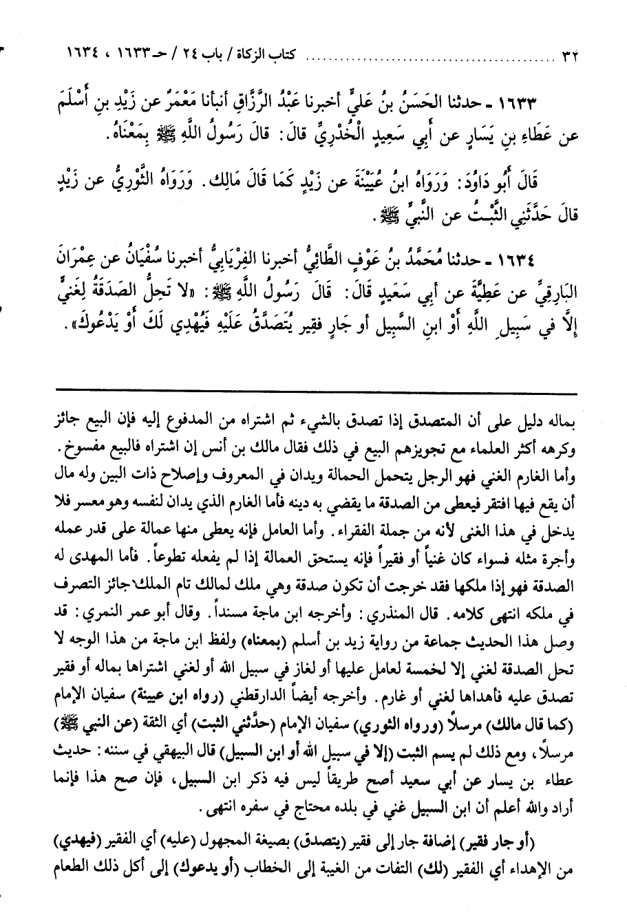 (إِلَّا في سبيل الله أو بن السَّبِيلِ) قَالَ الْبَيْهَقِيُّ فِي سُنَنِهِ حَدِيثُ عَطَاءِ بْنِ يَسَارٍ عَنْ أَبِي سَعِيدٍ أَصَحُّ طَرِيقًا ليس فيه ذكر بن السَّبِيلِ فَإِنْ صَحَّ هَذَا فَإِنَّمَا أَرَادَ وَاللَّهُ أعلم أن بن السَّبِيلِ غَنِيٌّ فِي بَلَدِهِ مُحْتَاجٌ فِي سَفَرِهِ انْتَهَى