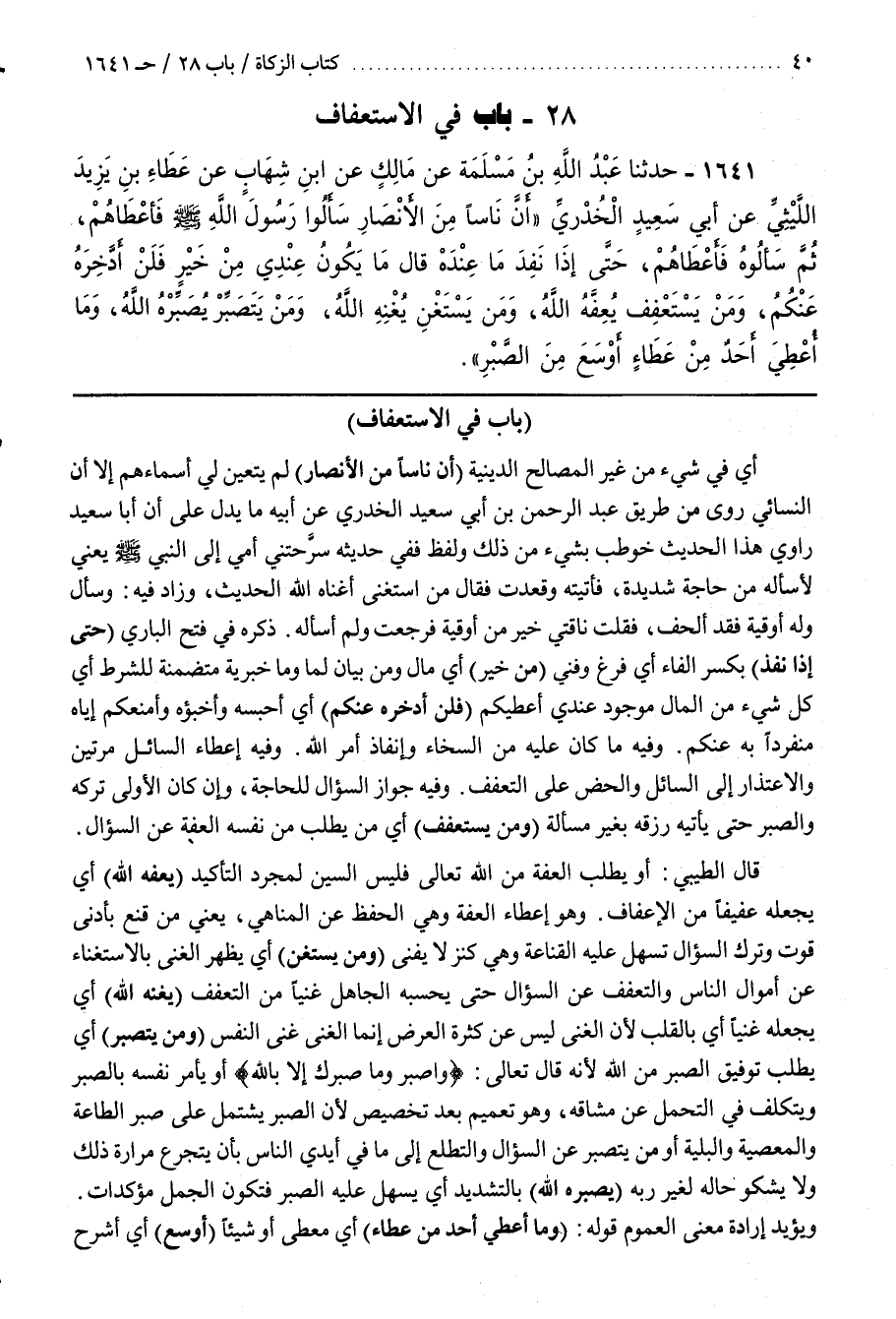 وَهُوَ إِعْطَاءُ الْعِفَّةِ وَهِيَ الْحِفْظُ عَنِ الْمَنَاهِي يَعْنِي مَنْ قَنَعَ بِأَدْنَى قُوتٍ وَتَرَكَ السُّؤَالَ تَسْهُلُ عَلَيْهِ الْقَنَاعَةُ وَهِيَ كَنْزٌ لَا يَفْنَى (وَمَنْ يَسْتَغْنِ) أَيْ يُظْهِرِ الْغِنَى بِالِاسْتِغْنَاءِ عَنْ أَمْوَالِ النَّاسِ وَالتَّعَفُّفُ عَنِ السُّؤَالُ حَتَّى يَحْسَبَهُ الْجَاهِلُ غَنِيًّا مِنَ التَّعَفُّفِ (يُغْنِهِ اللَّهُ) أَيْ يَجْعَلْهُ غَنِيًّا أَيْ بِالْقَلْبِ لِأَنَّ الْغِنَى لَيْسَ عَنْ كَثْرَةِ الْعَرَضِ إِنَّمَا غِنَى النَّفْسِ (وَمَنْ يَتَصَبَّرْ) أَيْ يَطْلُبْ تَوْفِيقَ الصَّبْرِ مِنَ اللَّهِ لِأَنَّهُ قَالَ تَعَالَى وَاصْبِرْ وما صبرك إلا بالله أَيْ يَأْمُرْ نَفْسَهُ بِالصَّبْرِ وَيَتَكَلَّفْ فِي التَّحَمُّلِ عَنْ مَشَاقِّهِ وَهُوَ تَعْمِيمٌ بَعْدَ تَخْصِيصٍ لِأَنَّ الصَّبْرَ يَشْتَمِلُ عَلَى صَبْرِ الطَّاعَةِ وَالْمَعْصِيَةِ وَالْبَلِيَّةِ أَوْ مَنْ يَتَصَبَّرْ عَنِ السُّؤَالِ وَالتَّطَلُّعِ إِلَى مَا فِي أَيْدِي النَّاسِ بِأَنَّ يَتَجَرَّعَ مَرَارَةَ ذَلِكَ وَلَا يَشْكُو حَالَهُ لِغَيْرِ رَبِّهِ (يُصَبِّرْهُ اللَّهُ) بِالتَّشْدِيدِ أَيْ يُسَهِّلُ عَلَيْهِ الصَّبْرَ فَتَكُونُ الْجُمَلُ مُؤَكَّدَاتٍ