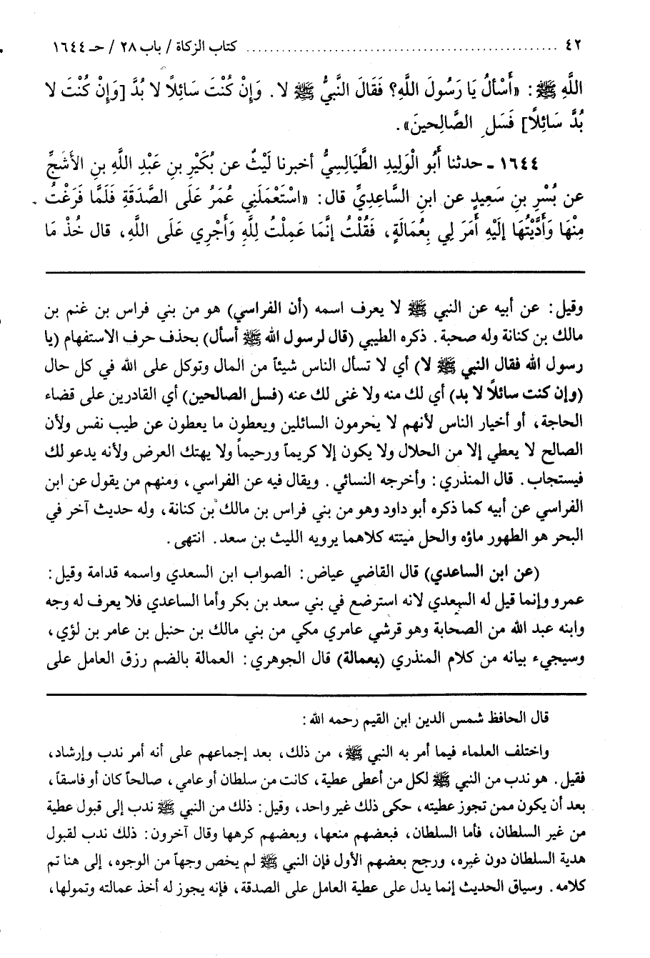 [1647] (عن بن الساعدي) قال القاضي عياض الصواب بن السَّعْدِيِّ وَاسْمُهُ قُدَامَةُ وَقِيلَ عَمْرٌو وَإِنَّمَا قِيلَ لَهُ السَّعْدِيُّ لِأَنَّهُ اسْتَرْضَعَ فِي بَنِي سَعْدِ بْنِ بَكْرٍ وَأَمَّا السَّاعِدِيُّ فَلَا يُعْرَفُ لَهُ وَجْهٌ وَابْنُهُ عَبْدُ اللَّهِ مِنَ الصَّحَابَةِ وَهُوَ قُرَشِيٌّ عَامِرِيٌّ مَكِّيٌّ مِنْ بَنِي مَالِكِ بْنِ حَنْبَلِ بْنِ عَامِرِ بْنِ لُؤَيٍّ وَسَيَجِيءُ بَيَانُهُ مِنْ كَلَامِ الْمُنْذِرِيِّ بِعُمَالَةٍ) قَالَ الْجَوْهَرِيُّ الْعُمَالَةُ بِالضَّمِّ رِزْقُ الْعَامِلِ عَلَى