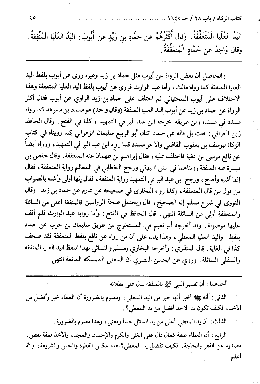 وَالْحَاصِلُ أَنَّ بَعْضَ الرُّوَاةِ عَنْ أَيُّوبَ مِثْلَ حَمَّادِ بْنِ زَيْدٍ وَغَيْرِهِ رَوَى عَنْ أَيُّوبَ بِلَفْظِ الْيَدِ الْعُلْيَا الْمُنْفِقَةُ كَمَا رَوَاهُ مَالِكٌ وأما عبد الوراث فَرَوَى عَنْ أَيُّوبَ بِلَفْظِ الْيَدُ الْعُلْيَا وَهَذَا الِاخْتِلَافُ عَلَى أَيُّوبَ السَّخْتِيَانِيِّ ثُمَّ اخْتُلِفَ عَلَى حَمَّادِ بْنِ زَيْدٍ الرَّاوِي عَنْ أَيُّوبَ فَقَالَ أَكْثَرُ الرُّوَاةِ عَنْ حَمَّادِ بْنِ زَيْدٍ عَنْ أَيُّوبَ الْيَدُ الْعُلْيَا الْمُنْفِقَةُ (وَقَالَ وَاحِدٌ) هُوَ مُسَدَّدُ بْنُ مُسَرْهَدٍ كَمَا رَوَاهُ مُسَدَّدٌ فِي مسنده ومن طريقه أخرجه بن عَبْدِ الْبَرِّ فِي التَّمْهِيدِ كَذَا فِي الْفَتْحِ