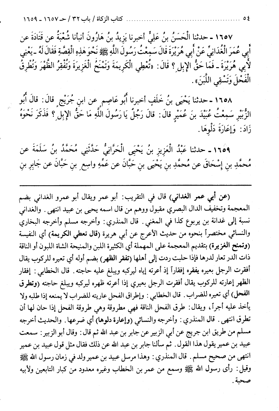 وَالْغُدَانِيُّ نِسْبَةً إِلَى غُدَانَةَ بْنِ يَرْبُوعٍ كَذَا فِي الْمُغْنِي قَالَ الْمُنْذِرِيُّ وَأَخْرَجَهُ مُسْلِمٌ وَأَخْرَجَهُ الْبُخَارِيُّ مُخْتَصَرًا بِنَحْوِهِ مِنْ حَدِيثِ الْأَعْرَجِ عَنْ أَبِي هُرَيْرَةَ (قَالَ تُعْطِي الْكَرِيمَةَ) أَيِ النَّفِيسَةَ (وَتَمْنَحُ الْغَزِيرَةَ) بِتَقْدِيمِ الْمُعْجَمَةِ عَلَى الْمُهْمَلَةِ أَيِ الْكَثِيرَةَ اللَّبَنِ وَالْمَنِيحَةُ الشَّاةُ اللَّبُونُ أَوِ النَّاقَةُ ذَاتُ الدَّرِّ تُعَارُ لِدَرِّهَا فَإِذَا حُلِبَتْ رُدَّتْ إِلَى أَهْلِهَا (تُفْقِرُ الظَّهْرَ) بِضَمِّ أَوَّلِهِ أَيْ تُعِيرُهُ لِلرُّكُوبِ يُقَالُ أَفْقَرْتُ الرَّجُلَ بَعِيرَهُ يُفْقِرُهُ إفقارا إذ أَعَرْتُهُ إِيَّاهُ لِيَرْكَبَهُ وَيَبْلُغَ عَلَيْهِ حَاجَتَهُ