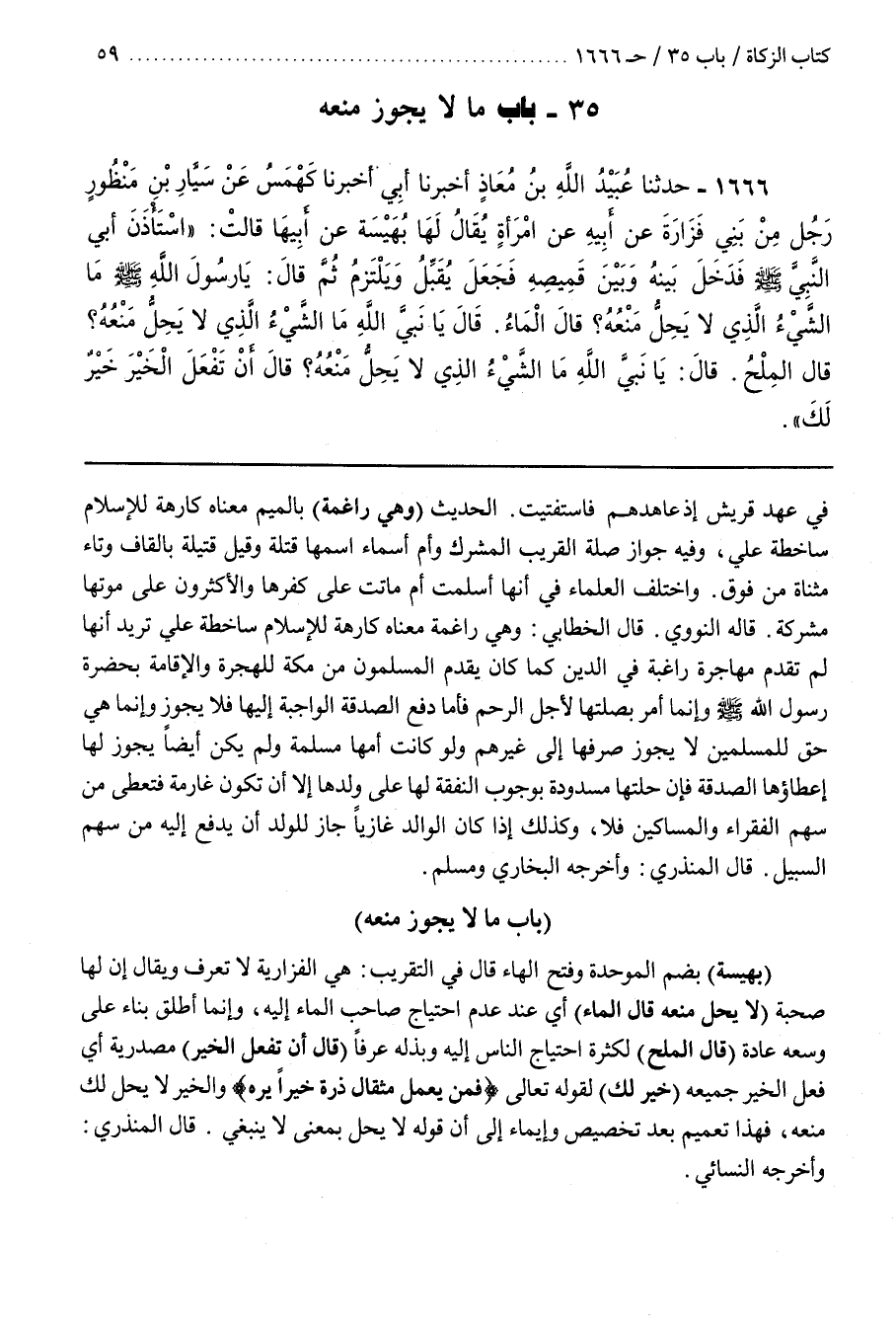 [1669] (بُهَيْسَةَ) بِضَمِّ الْمُوَحَّدَةِ وَفَتْحِ الْهَاءِ قَالَ فِي التَّقْرِيبِ هِيَ الْفَزَارِيَّةُ لَا تُعْرَفُ وَيُقَالُ إِنَّ لَهَا صُحْبَةٌ (لَا يَحِلُّ مَنْعُهُ قَالَ الْمَاءُ) أَيْ عِنْدَ عَدَمِ احْتِيَاجِ صَاحِبِ الْمَاءِ إِلَيْهِ وَإِنَّمَا أَطْلَقَ بِنَاءً عَلَى وُسْعِهِ عَادَةً (قَالَ الْمِلْحُ) لِكَثْرَةِ احْتِيَاجِ النَّاسِ إِلَيْهِ وَبَذْلِهِ عُرْفًا (قَالَ أَنْ تَفْعَلَ الْخَيْرَ) مَصْدَرِيَّةٌ أَيْ فِعْلُ الْخَيْرِ جَمِيعُهُ (خَيْرٌ لَكَ) لِقَوْلِهِ تَعَالَى فَمَنْ يَعْمَلْ مِثْقَالَ ذَرَّةٍ خَيْرًا يَرَهُ وَالْخَيْرُ لَا يَحِلُّ لَكَ مَنْعُهُ فَهَذَا تَعْمِيمٌ بَعْدَ تَخْصِيصٍ وَإِيمَاءٌ إِلَى أَنَّ قَوْلَهُ لَا يَحِلُّ بِمَعْنَى لَا يَنْبَغِي