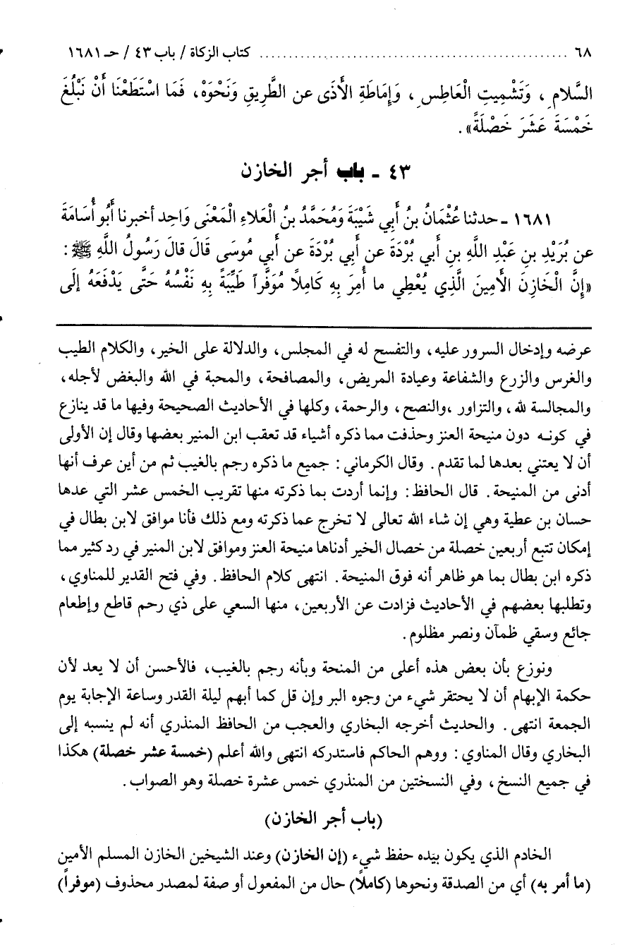 عِرْضِهِ وَإِدْخَالُ السُّرُورِ عَلَيْهِ وَالتَّفَسُّحُ لَهُ فِي الْمَجْلِسِ وَالدَّلَالَةُ عَلَى الْخَيْرِ وَالْكَلَامُ الطَّيِّبُ وَالْغَرْسُ والزرع والشفاعة وعياذة الْمَرِيضِ وَالْمُصَافَحَةُ وَالْمَحَبَّةُ فِي اللَّهِ وَالْبُغْضُ لِأَجْلِهِ وَالْمُجَالَسَةُ لِلَّهِ وَالتَّزَاوُرُ وَالنُّصْحُ وَالرَّحْمَةُ وَكُلُّهَا فِي الْأَحَادِيثِ الصَّحِيحَةِ وَفِيهَا مَا قَدْ يُنَازَعُ فِي كَوْنِهِ دُونَ مَنِيحَةِ الْعَنْزِ وَحَذَفْتُ مِمَّا ذَكَرَهُ أشياء قد تعقب بن الْمُنِيرِ بَعْضَهَا وَقَالَ إِنَّ الْأَوْلَى أَنْ لَا يُعْتَنَى بَعَدِّهَا لِمَا تَقَدَّمَ